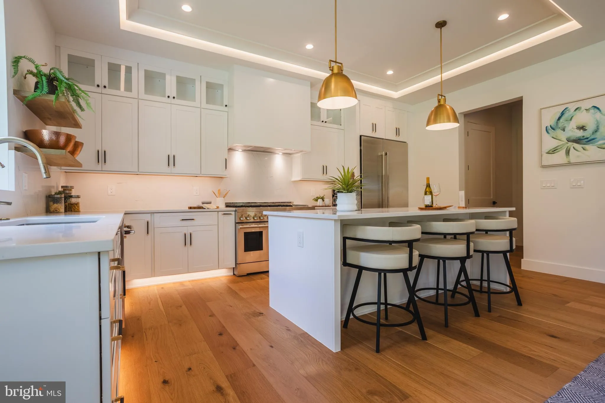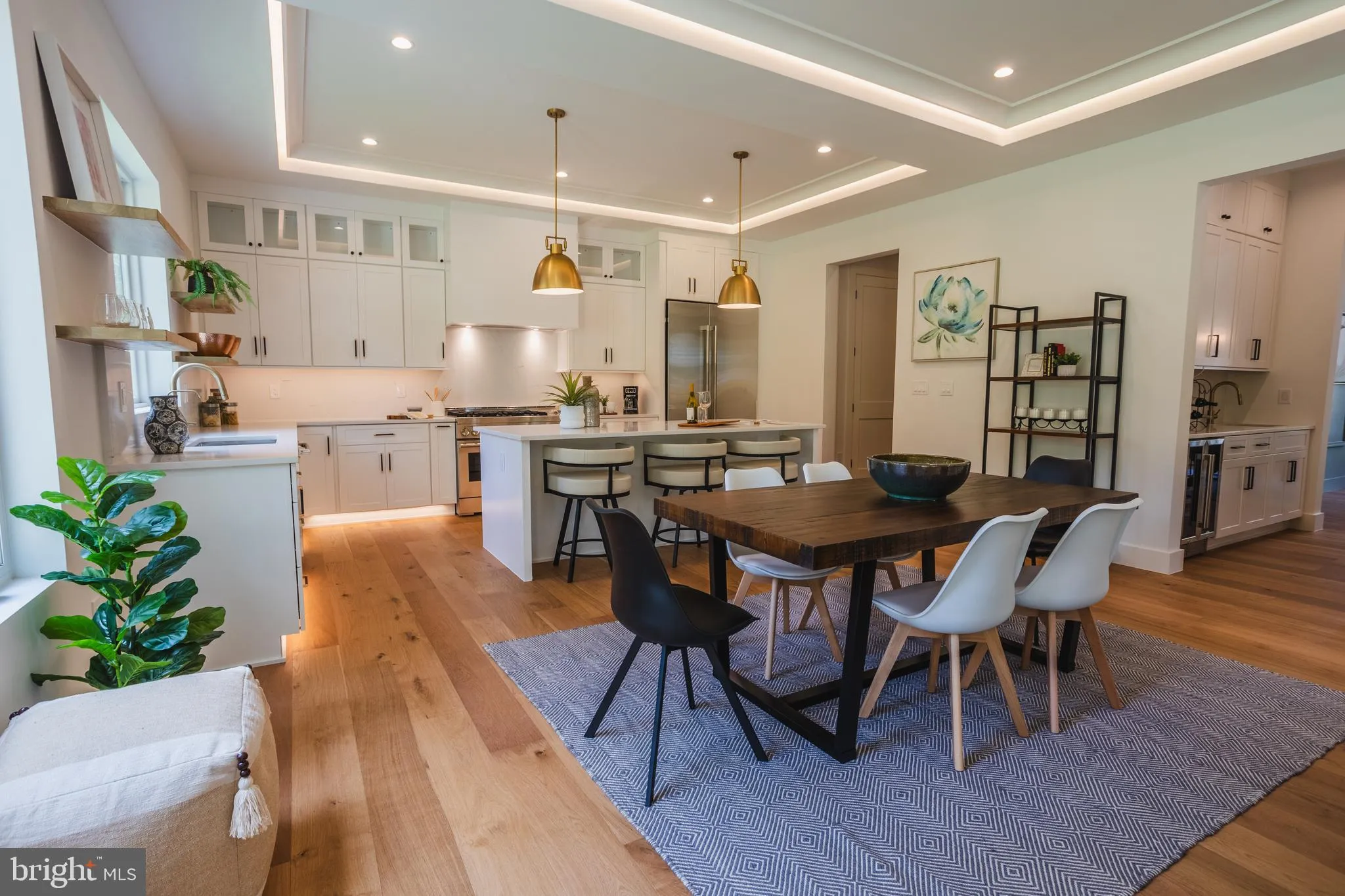 Upon entry, the foyer draws you into the formal dining room with feature wall, ideal for entertaining, and a modern office or main level suite with full bath. Through the hallway is the family room, featuring crown molding with LED lights around a tray ceiling above a gas fireplace, which leads seamlessly into the wrap-around covered porch and rear deck, the ideal combination of indoor/outdoor living space. Beyond the family room is the informal dining area, which transitions beautifully into the gourmet kitchen with oversized island, high-end stainless-steel JennAir luxury appliances, custom tiles, glamorous lighting, and butler’s pantry. Direct kitchen access through the mud room and two-car garage with electrical charging outlet. 10ft ceilings on main level.
