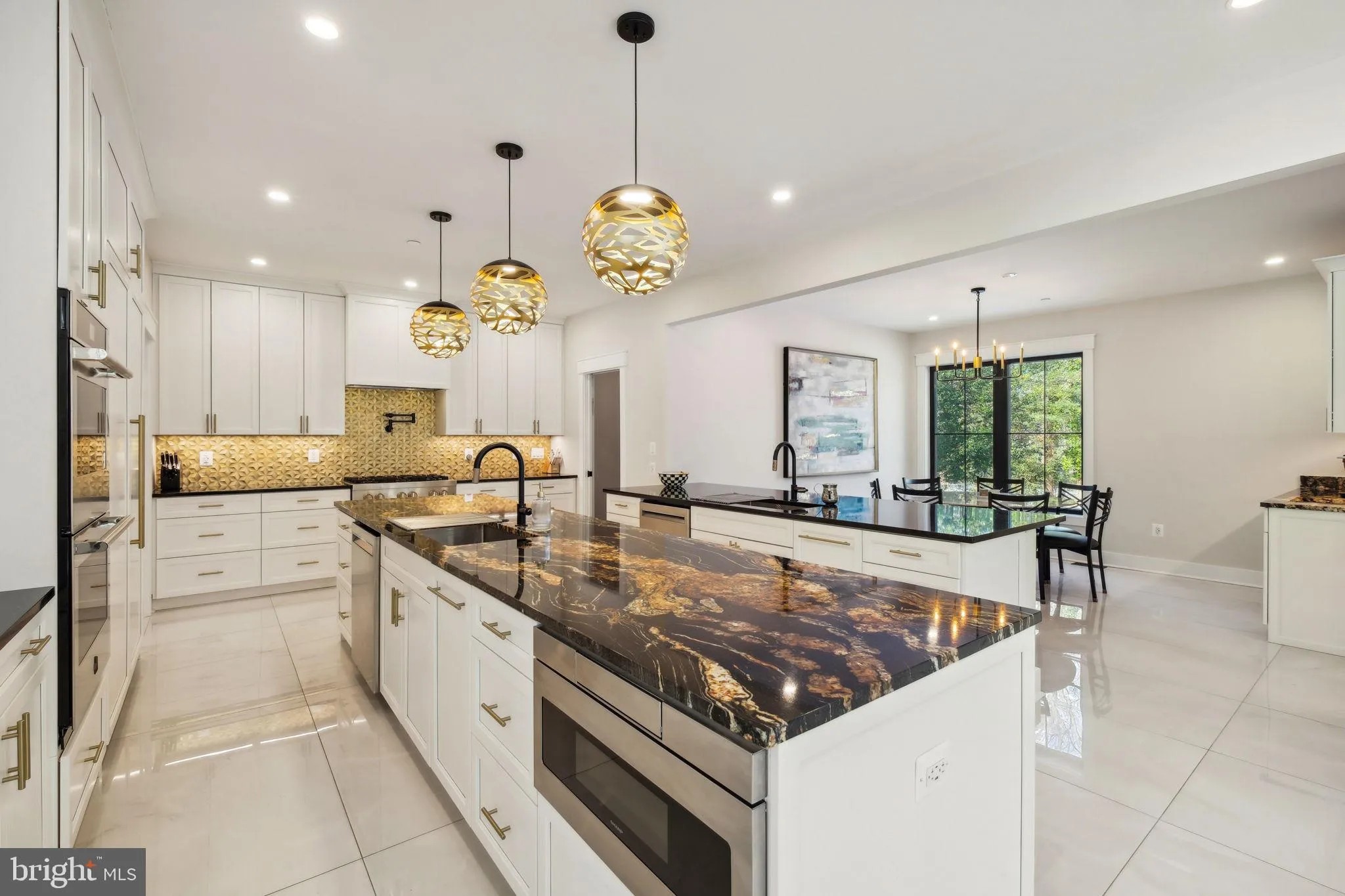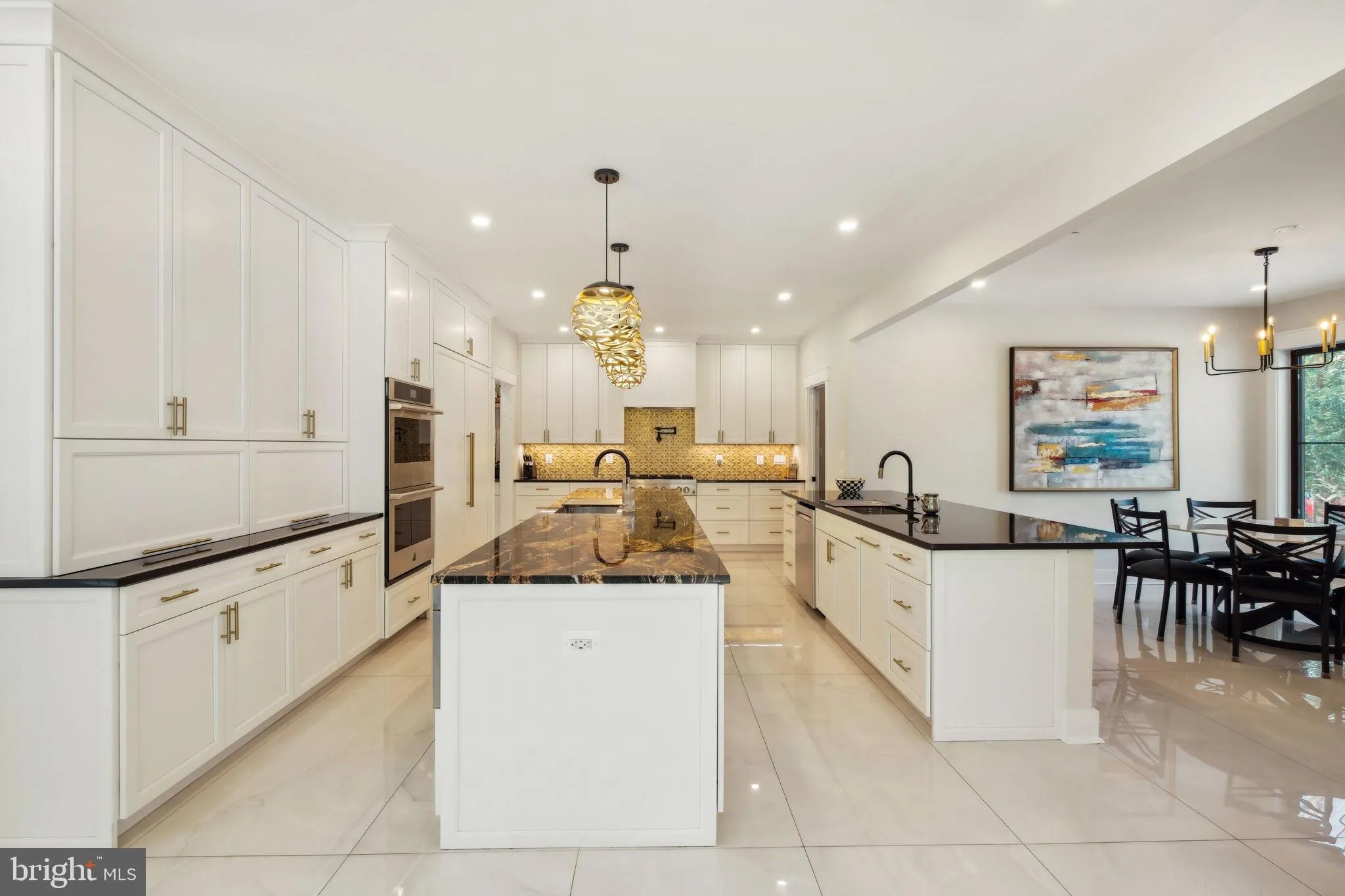 Step inside to find custom-designed elements, harmoniously coordinated color schemes, and high-end flooring that define the sophisticated interior aesthetic. At the heart of the home, the open-concept gourmet kitchen invites culinary creativity with its dual islands, luxurious granite countertops, and sleek custom cabinetry. Top-of-the-line finishes include Brizo faucets, a six-burner gas stove with a pot filler, and a charming coffee nook. A sliding barn door reveals a generously sized walk-in pantry, offering both convenience and style.