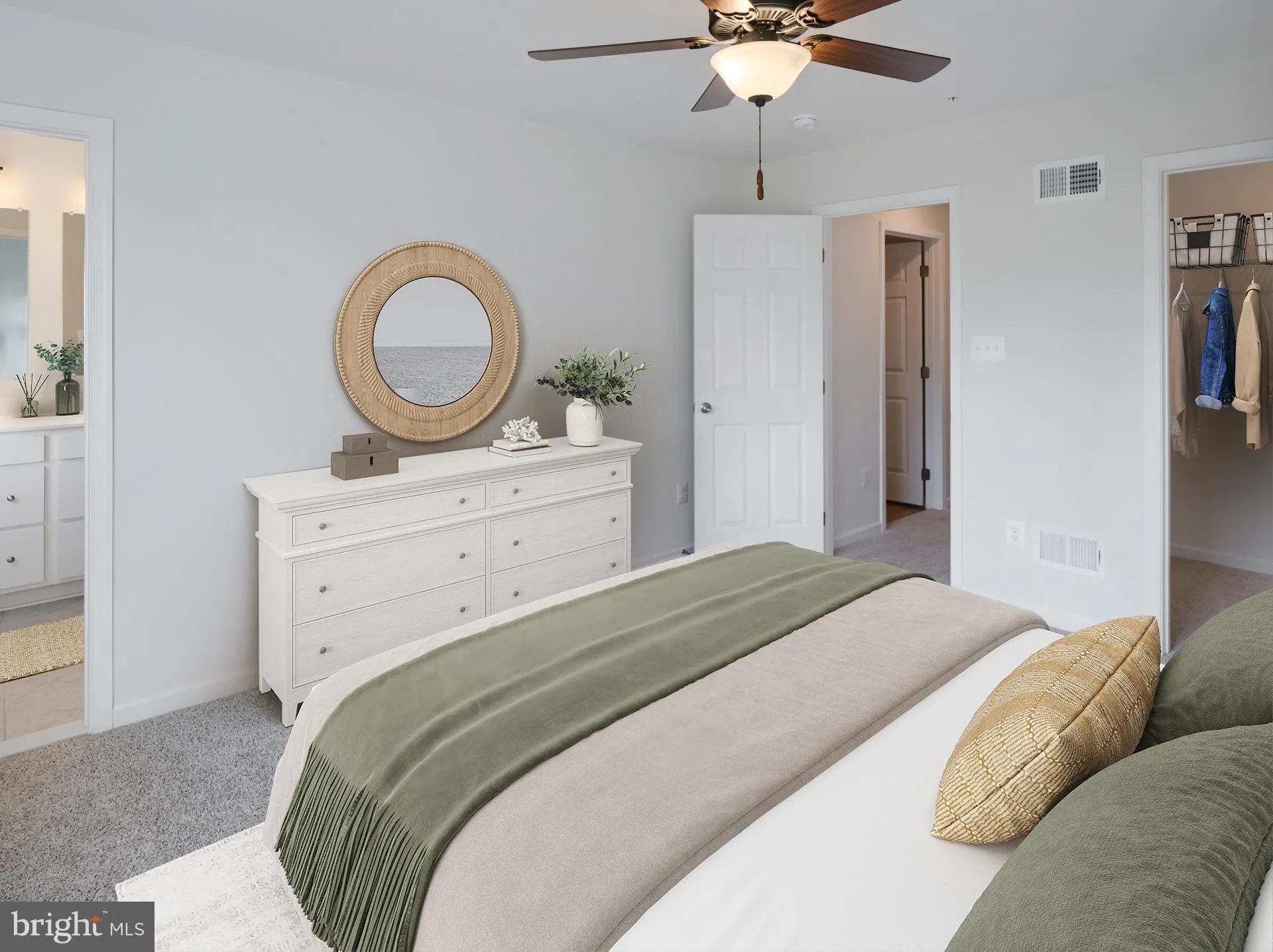 This Hayward Traditional is a well-designed three-story townhome end unit with 4 bedrooms and 3.5 bathrooms. On the 1st floor, a welcoming Foyer with a coat closet provides easy access to the garage. Down the hall, a flexible living space and a private Guest Suite with a walk-in closet and ensuite full bath offer an ideal setup for visitors or multi-generational living. The 2nd floor serves as the heart of the home, featuring an open-concept layout that seamlessly connects the spacious Family Room, Kitchen, and Dining Area. The Kitchen includes quartz countertops, a sleek tile backsplash, a gas range, Whirlpool stainless steel appliances, and extended cabinetry. Triple windows bring natural light into the Family Room, while glass doors in the Dining Area open to a composite deck, creating a perfect space for outdoor relaxation. A Powder Room and engineered plank flooring throughout enhance the home’s modern appeal. On the 3rd floor, the Owner’s Suite provides a private retreat with a walk-in closet and an ensuite bath with a dual vanity. Two additional bedrooms with double-door closets, a full bathroom, a Laundry Room, and a convenient hall closet complete this level, combining comfort and functionality.