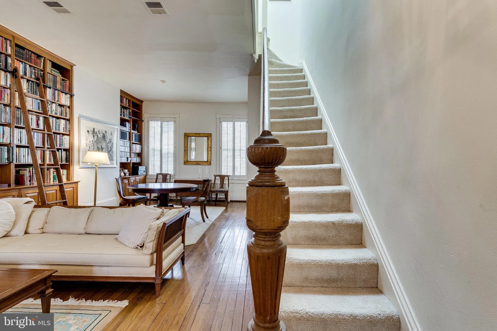 Beautiful and Charming Victorian Row House with three levels. Kitchen on main level has gas cooking, double sink, plenty of storage and access to relaxing brick patio and fenced backyard. Family room with hardwood flooring on this level with outside entrance. Upper level also has front entrance with double doorway, tall windows with shutters, hardwood flooring, floor to ceiling built-in library with rolling ladder, wood burning fireplace, adjacent dining area, and a half bath. Second upper level includes primary and secondary bedrooms and a full bath. Primary bedroom has carpet and boasts with elegance featuring perfect enclave for your bed and sitting area that can also be used as office space. Second bedroom also with carpet, plenty of light, and a ceiling fan. The updated full bath on bedroom level features spa-like shower and ceramic tile flooring.