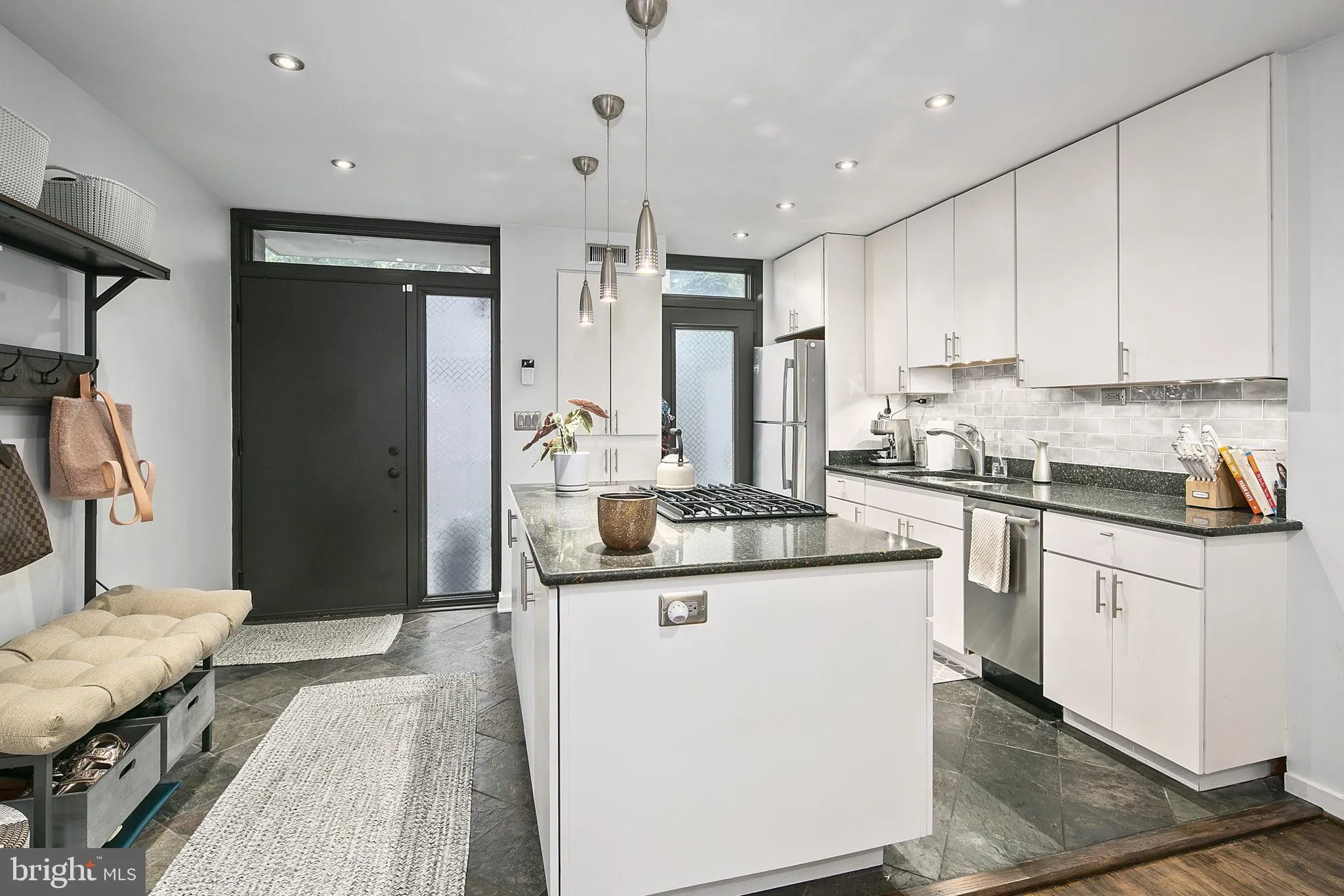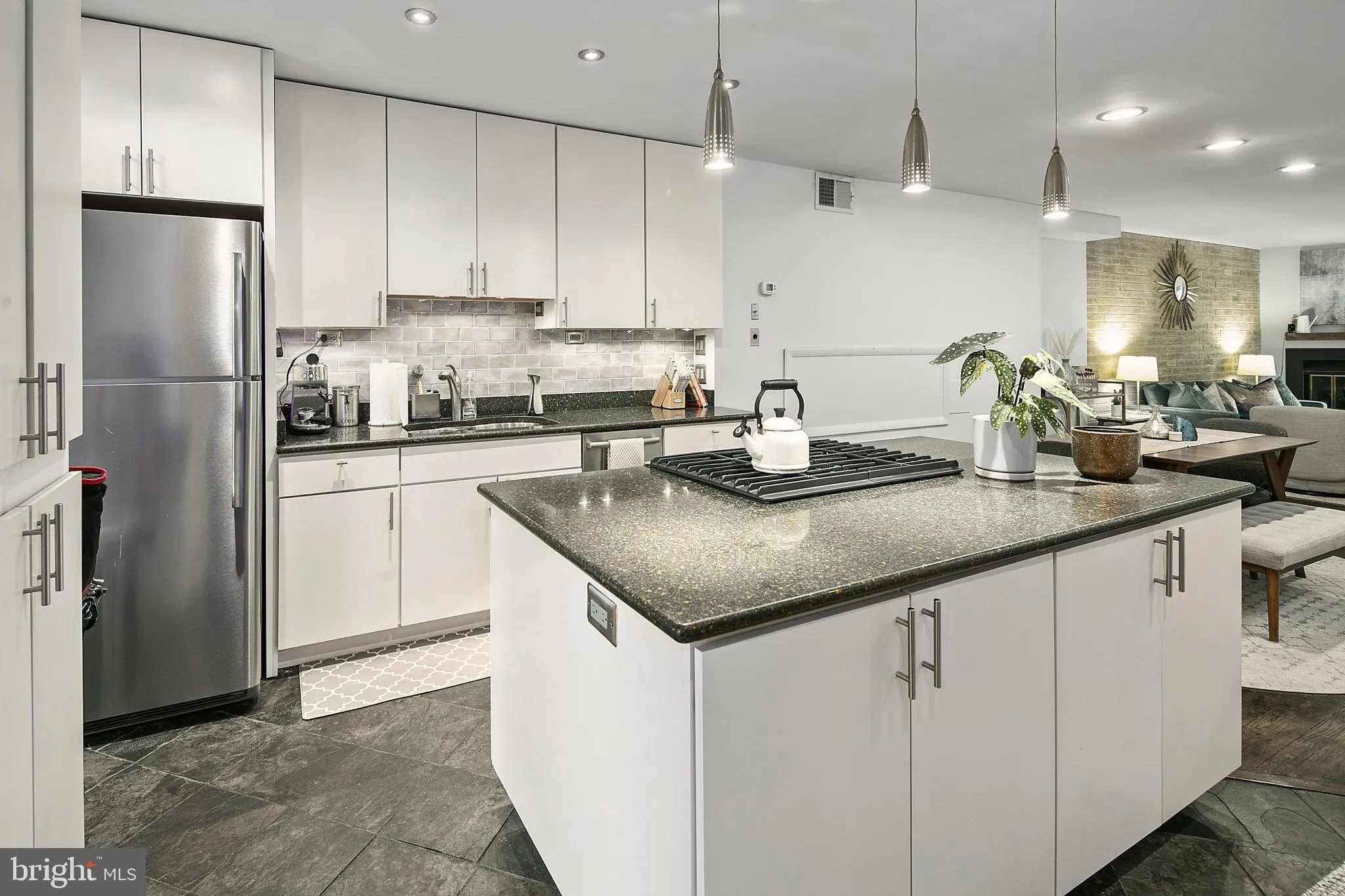 This stylish mid-century townhome, located in the coveted Carollsburg Community of Southwest, offering over 2500 sqft spanning 3 levels making this condo feel more like a single family home. Tucked away in a secured and peaceful enclave just off N Street with convenient access to all that living in Southwest Waterfront has to offer. A beautifully landscaped walkway leads up to the private and fenced in front entrance, with a patio and vibrant garden, welcoming you into the main level entrance. Natural light flowing effortlessy through a bright and airy open floor plan including an updated gourmet kitchen equipped with premier stainless steel appliances, granite counter tops; a center island with storage on each side and a cooktop. The adjoining dining room offers ample light and plenty of seating and design options. The spacious living room is anchored by an exposed brick wall and gas fireplace with a large floor to ceiling window and glass door bringing in natural light leading out into the rear garden, a true oasis, complete with a brand-new deck, mature landscaping, space for grilling (grill conveys), and areas for sunbathing and al fresco dining. This serene space also provides direct access to a beautiful courtyard. Upstairs, a skylight brings natural light into the hallway, leading to the tranquil primary bedroom with an en-suite bath. A generous guest bedroom and another full bath completes this level. Both bedrooms provide access to private balconies, offering tree-top views. The lower level includes a flexible family room or potential home gym, office, or guest suite—complete with a fully renovated full bathroom (2025). There’s also a large, dedicated laundry offering ample space for storage, crafting or hobby. The location is unbeatable! Just steps from Waterfront Metro, minutes from the Wharf, Navy Yard, National’s Park, downtown D.C, word class dining, theaters, shopping and more! Don’t miss this amazing and rare opportunity to own a unique homes like this one!