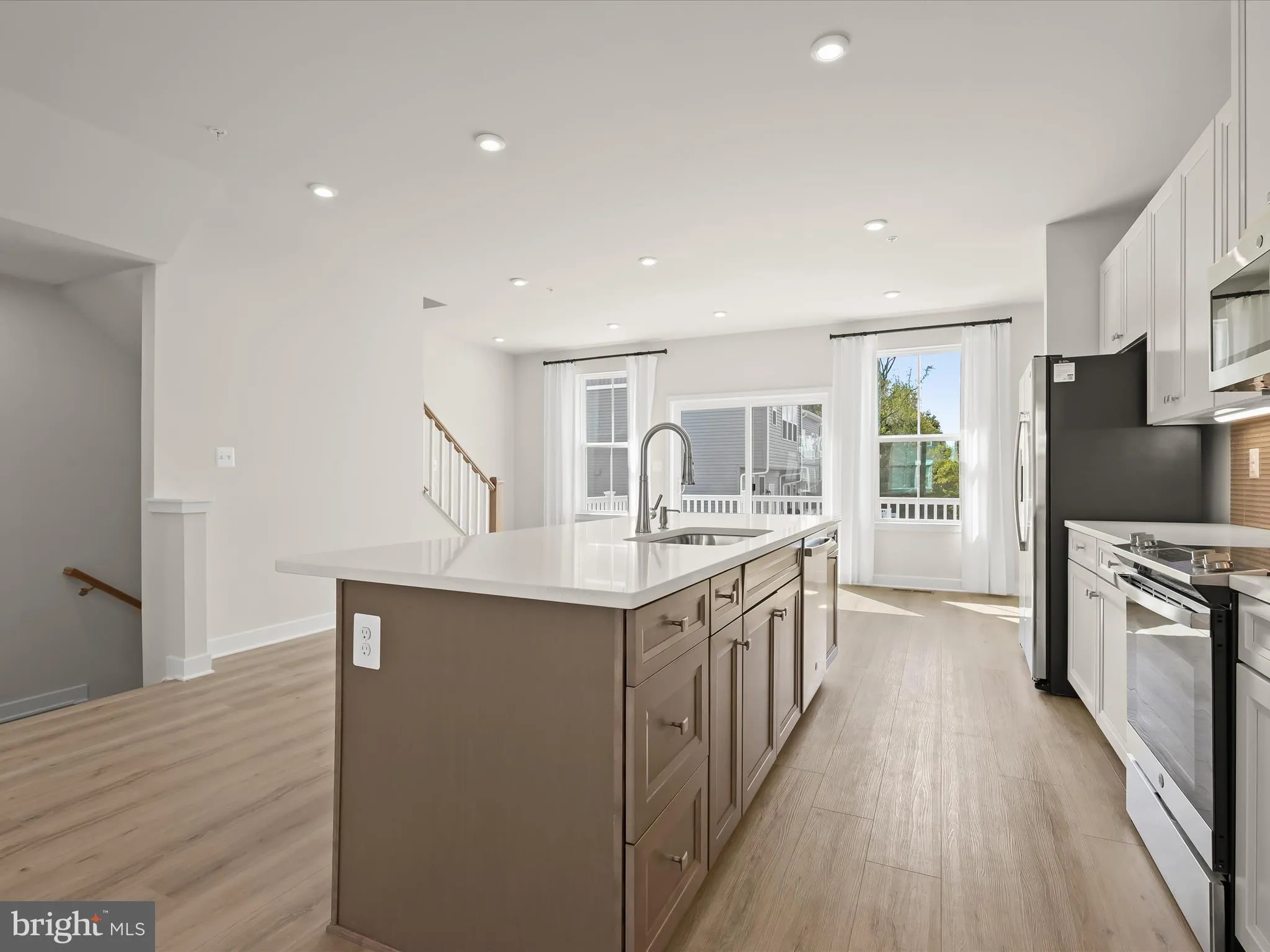 Discover the pinnacle of modern living in this 2024-built, never-lived-in townhome in the prestigious Wellington Farms community. Every detail has been thoughtfully designed to combine style, function, and comfort across three levels of exceptional living space. Step into the main level and immediately notice the open-concept layout that effortlessly connects the living and dining rooms with the chef-inspired kitchen at the heart of the home. Sunlight pours through a wall of living room windows, while the dining area’s sliding glass door opens to a large deck overlooking lush green community space, creating an inviting setting for entertaining or relaxing.