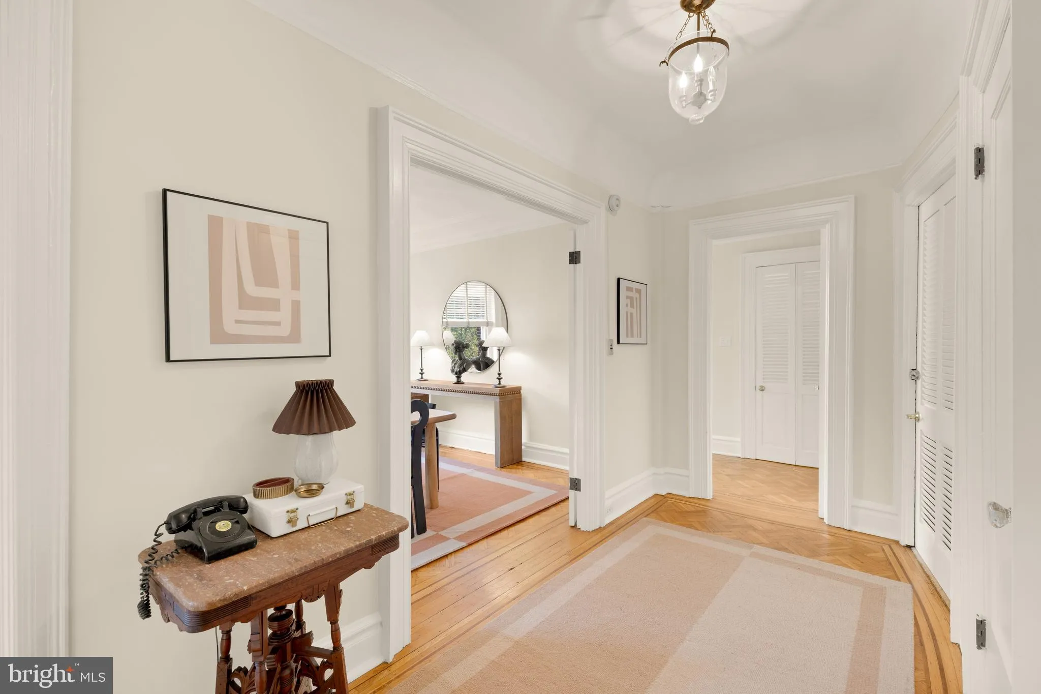 Unit 401 is a light-filled gem offering sweeping views that stretch as far as Rosslyn. As you enter, you’re greeted by a gracious foyer that opens into generously scaled living and dining rooms—ideal for entertaining or quiet enjoyment. The dining room (with two sets of french doors) could even be used as a bedroom or den offering great flexibility. The home features a spacious primary bedroom, abundant closet space, and a classic clawfoot tub, all surrounded by exquisite architectural details from a bygone era. Beautifully preserved original elements include warm hardwood floors, soaring 9-foot ceilings, and intricate crown molding, creating an ambiance of sophistication and historic charm.