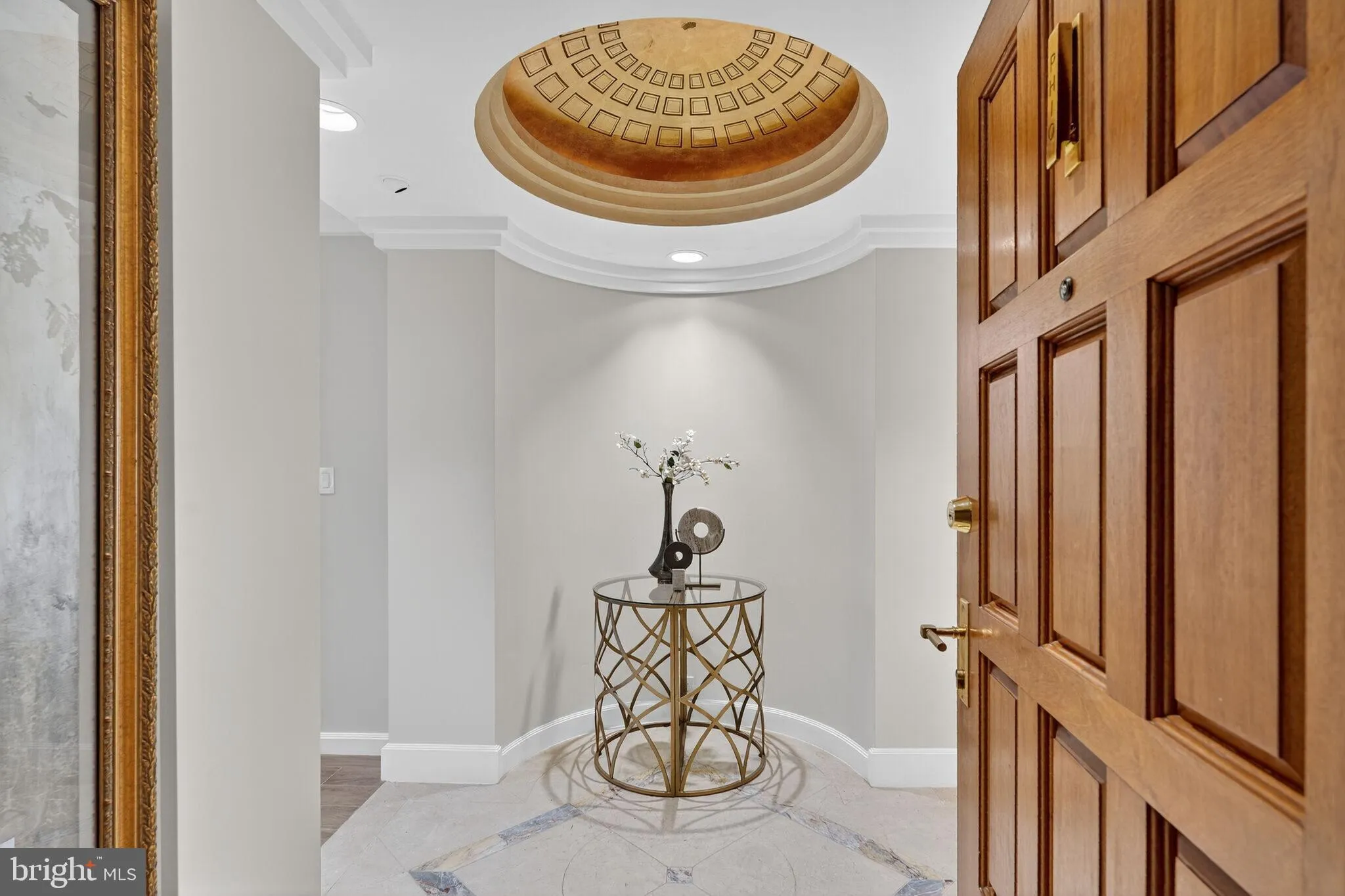 Step into timeless elegance through a grand circular foyer with a gold-painted dome, and dramatic columns. Inside, rich hardwood floors with intricate inlays, tray ceilings with cove lighting, and custom built-ins elevate every space—from the formal dining room to the living room and atrium sitting area. The recently renovated gourmet kitchen features Sub-Zero refrigerator, cooktop, a beverage fridge, expansive counters, a large island, and a breakfast bar—perfect for entertaining. The open-concept living room offers two exposures, two balconies, floor-to-ceiling windows, fireplaces, custom wet bar, and a Sonos sound system. A dedicated home office with custom built-ins and stunning views provides the ideal work-from-home setup.