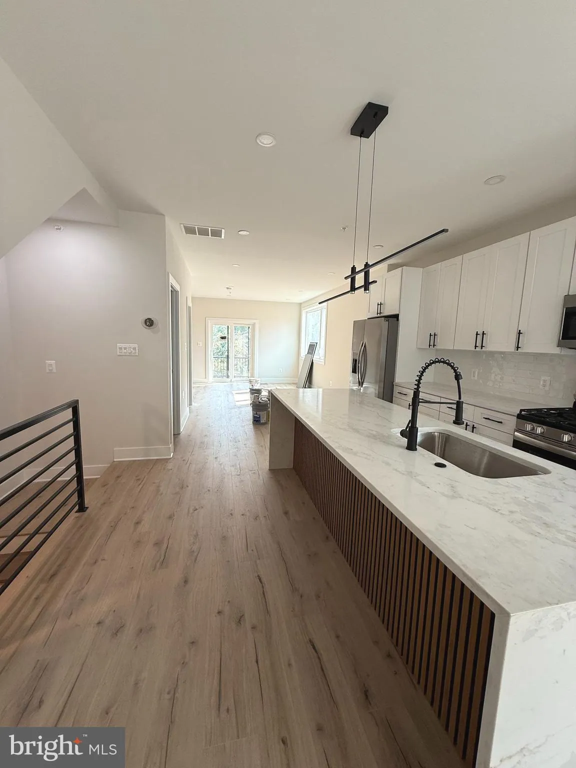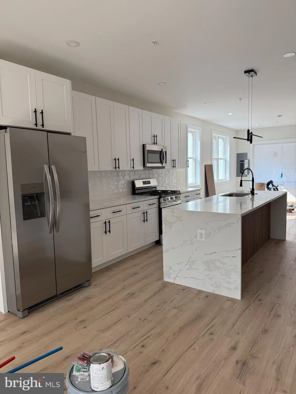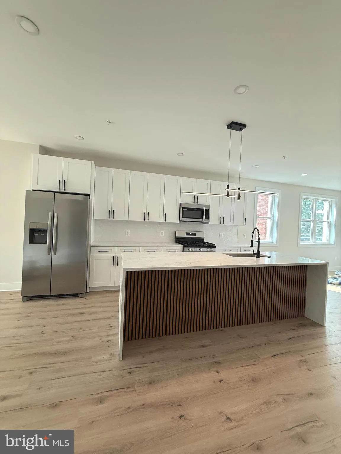 The main level showcases an open-concept design highlighted by a 9 ft quartz countertop, stainless steel appliances, and large windows that flood the home with natural light. A beautiful fireplace serves as a focal point, adding warmth and elegance to the modern finishes throughout.