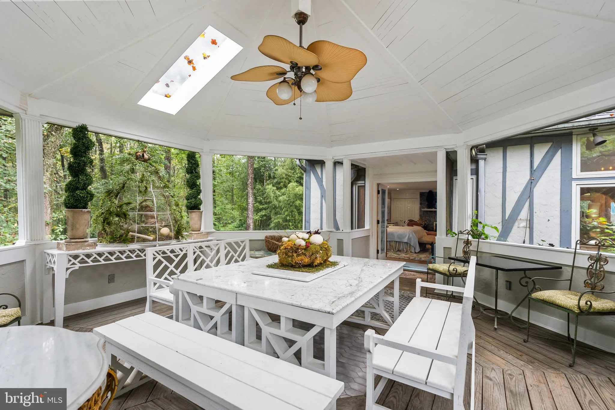 The approach begins with a gentle hilltop location and meticulously landscaped grounds framed by mature trees, setting the stage for the romantic architecture and elegant interiors. At the heart of the home, a stunning custom kitchen by Apex Homes features custom Neff cabinetry, professional-grade Wolf and Sub-Zero appliances, and an expansive design ideal for both everyday living and entertaining. The adjoining formal dining room is highlighted by a dramatic plaster groin-vaulted ceiling and walls of windows that capture serene views of the landscaped grounds and pool beyond. A sun-filled garden room opens directly to the rear terrace, blending indoor and outdoor living. The spacious main-level family room adjoins a paneled study providing the option of a first-floor primary suite.