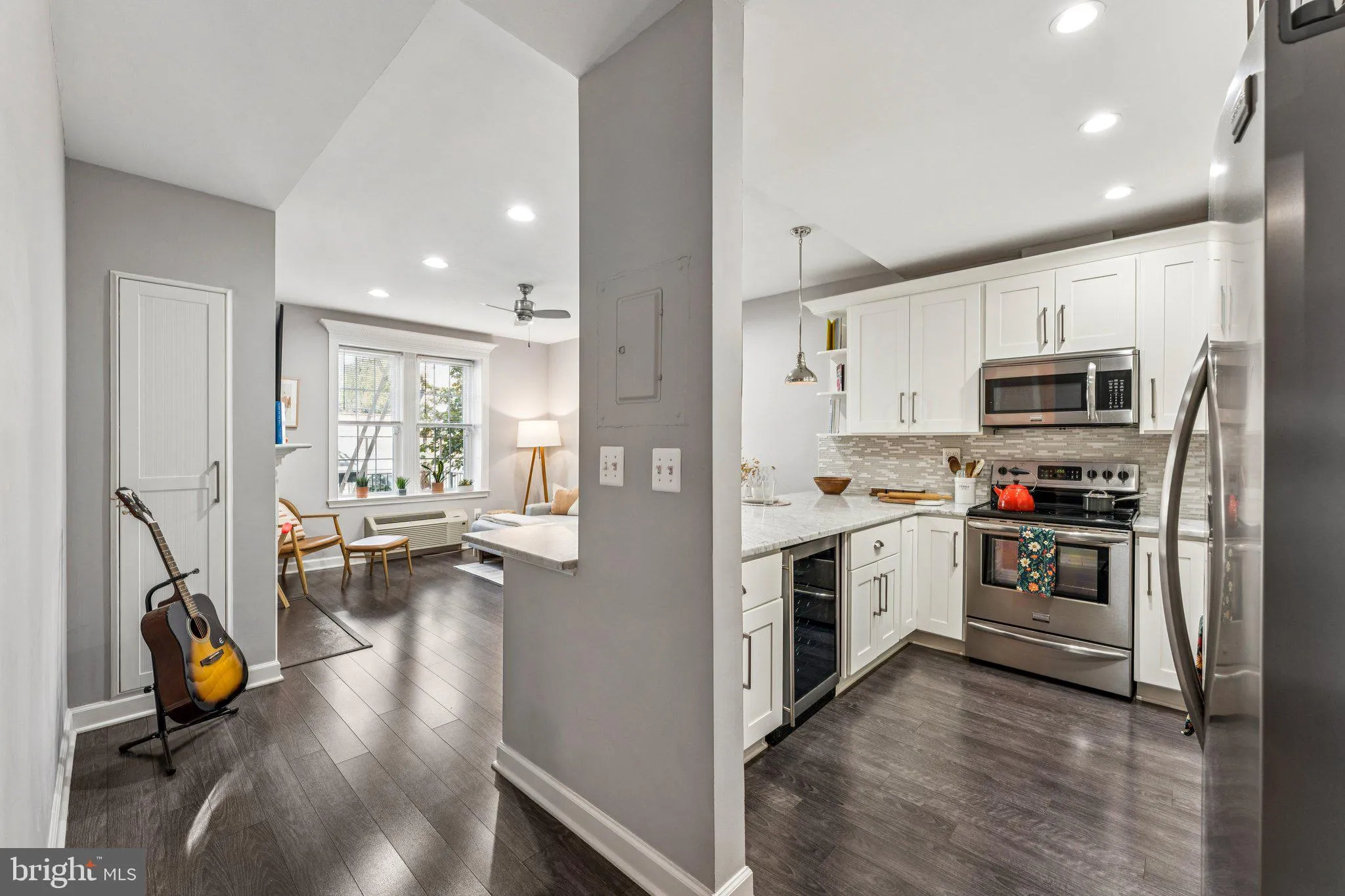 Now offering a $5,000 seller credit toward closing costs or an interest rate buy-down — welcome to 1833 California St NW, #203. Experience effortless city living in the heart of the historic and sought-after Adams Morgan neighborhood. The open and bright interior of this fully renovated 1-bedroom, 1-bathroom condo is designed for today’s modern lifestyle. Step inside and enjoy the luxury of an open floor plan, soaring high ceilings and chic bleached wood flooring throughout. The kitchen is an entertainer’s dream, featuring custom marble countertops, high-end stainless steel appliances, and a must-have wine refrigerator perfect for effortless entertaining. Relax and unwind next to your cozy wood-burning fireplace, an exceptional amenity that sets this unit apart. The large primary bedroom provides a tranquil retreat with ample storage. The unit also includes the practical luxury of an in-unit washing machine. Building amenities include secure bike storage and a delightful community patio perfect for enjoying warm Spring and Summer evenings outdoors.