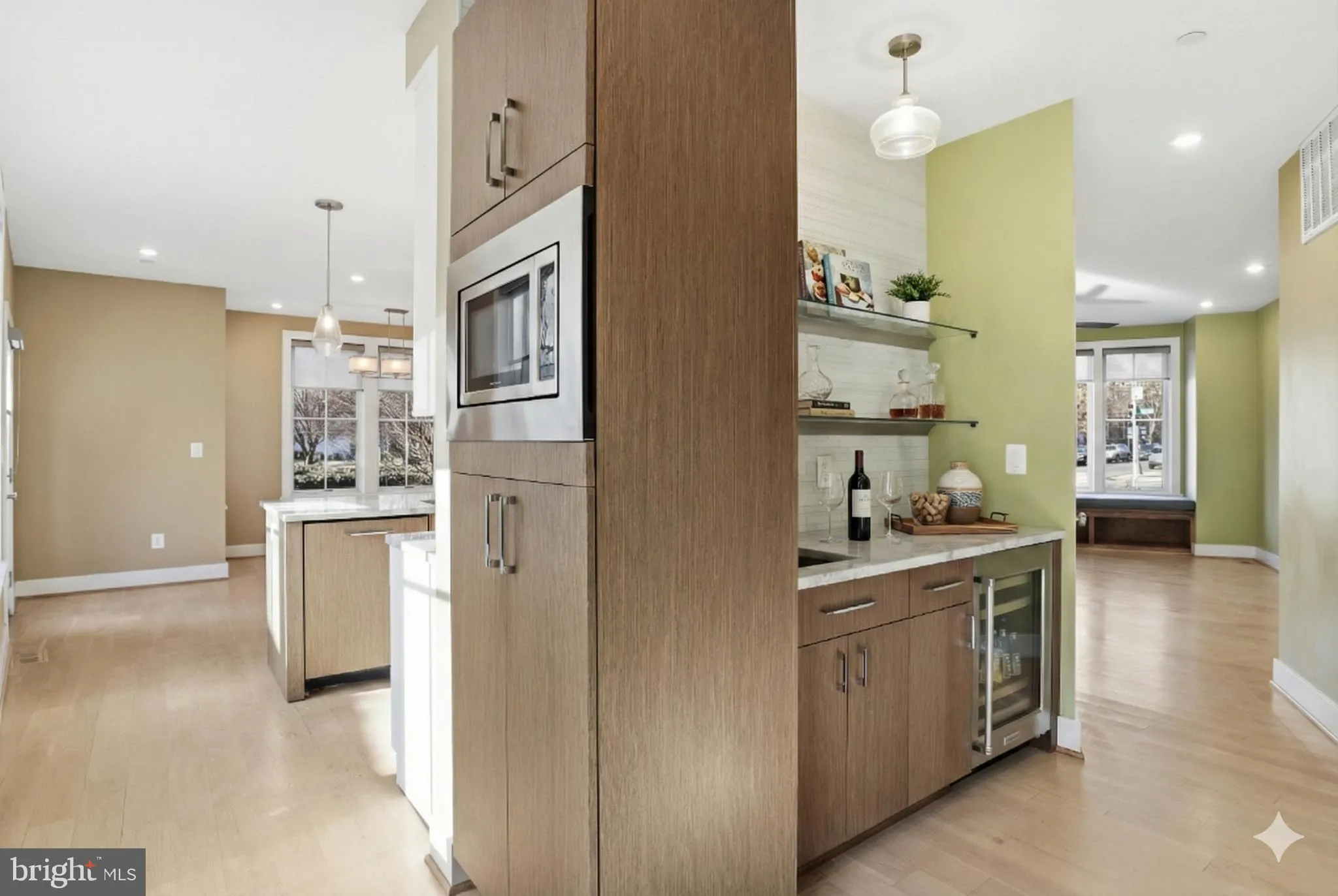 The main level welcomes you with hardwood floors and an open, airy layout designed for both everyday living and entertaining. The kitchen anchors the space with quartz countertops, a generous island, and clean contemporary finishes. A wet bar and conveniently located powder room add flexibility and ease for hosting.