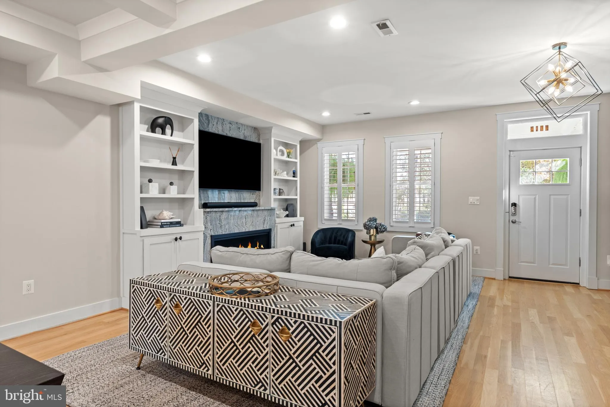 Step inside to find gracious proportions and elegant details at every turn. The inviting living room features a stunning built-in bookcase with a granite surround, creating a sophisticated focal point anchored by generous natural light. The adjoining dining room is enhanced by a newly installed coffered ceiling that adds both depth and character—an ideal setting for gatherings and dinner parties alike.
