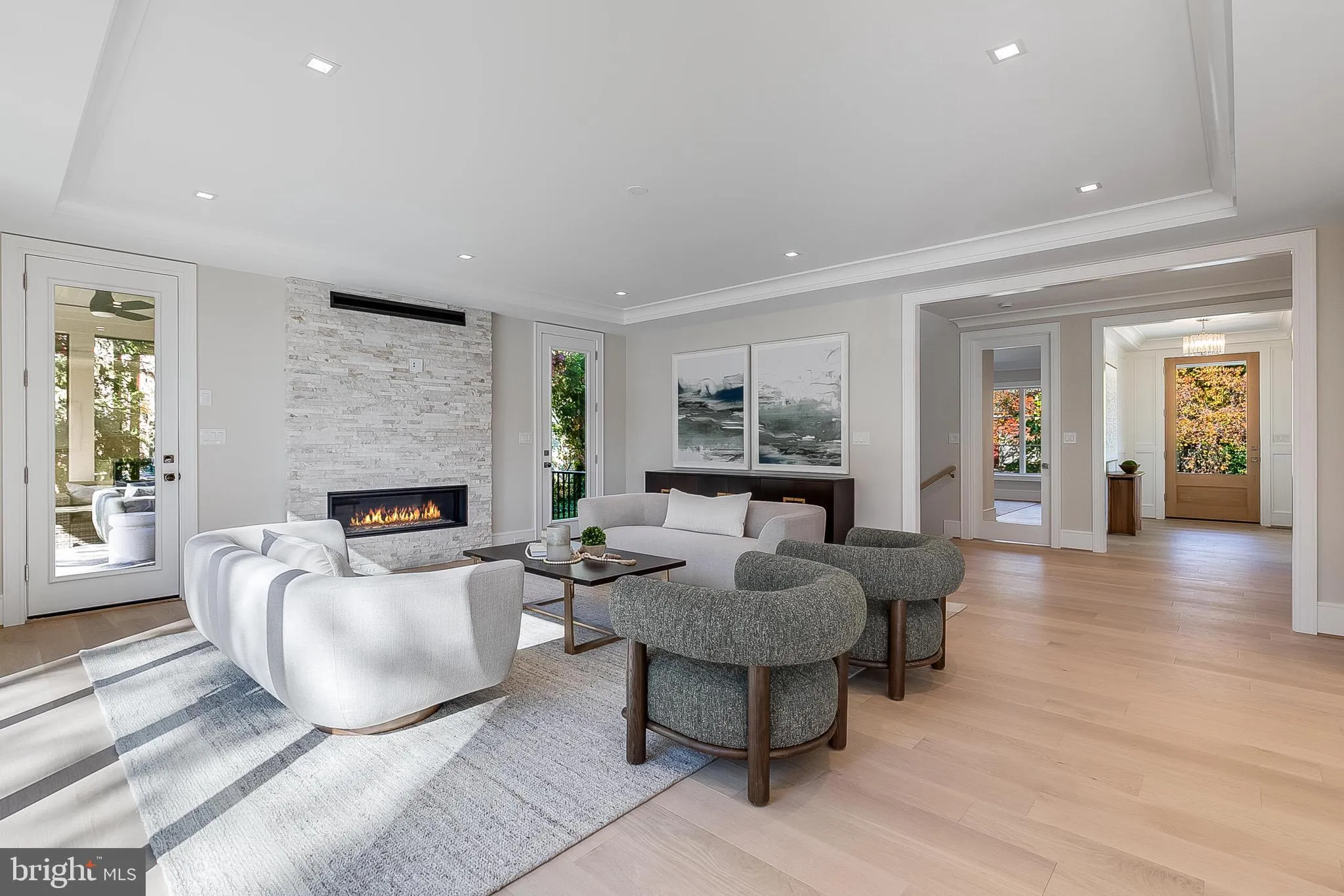 The main level features a spacious family room with linear stone fireplace and coffered ceiling, gourmet kitchen with quartz countertops, marble backsplash, custom cabinetry, and professional-grade Sub-Zero & Wolf appliances. Formal dining room, private study/bedroom with full bath, large pantry, and mudroom with built-ins. Screened porch with heaters and rear deck with gas hookup for grilling or fire pit.