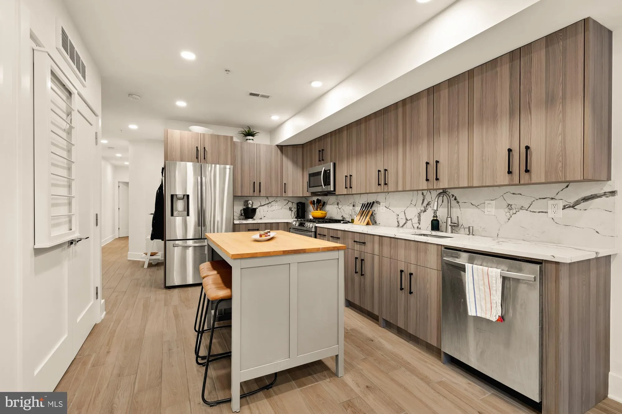 Built in 2020, this pet-friendly home features a bright, open layout centered around a stunning kitchen with flat-panel cabinetry, quartz countertops, and stainless steel appliances. Two spacious bedrooms provide excellent closet space, including a serene primary suite with a glass-enclosed shower, while the second bedroom enjoys access to a full hall bath with tub. Additional highlights include private front and rear entrances and an in-unit washer and dryer for ultimate convenience.