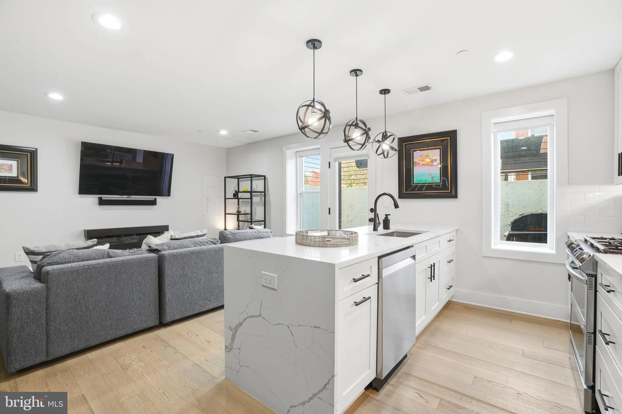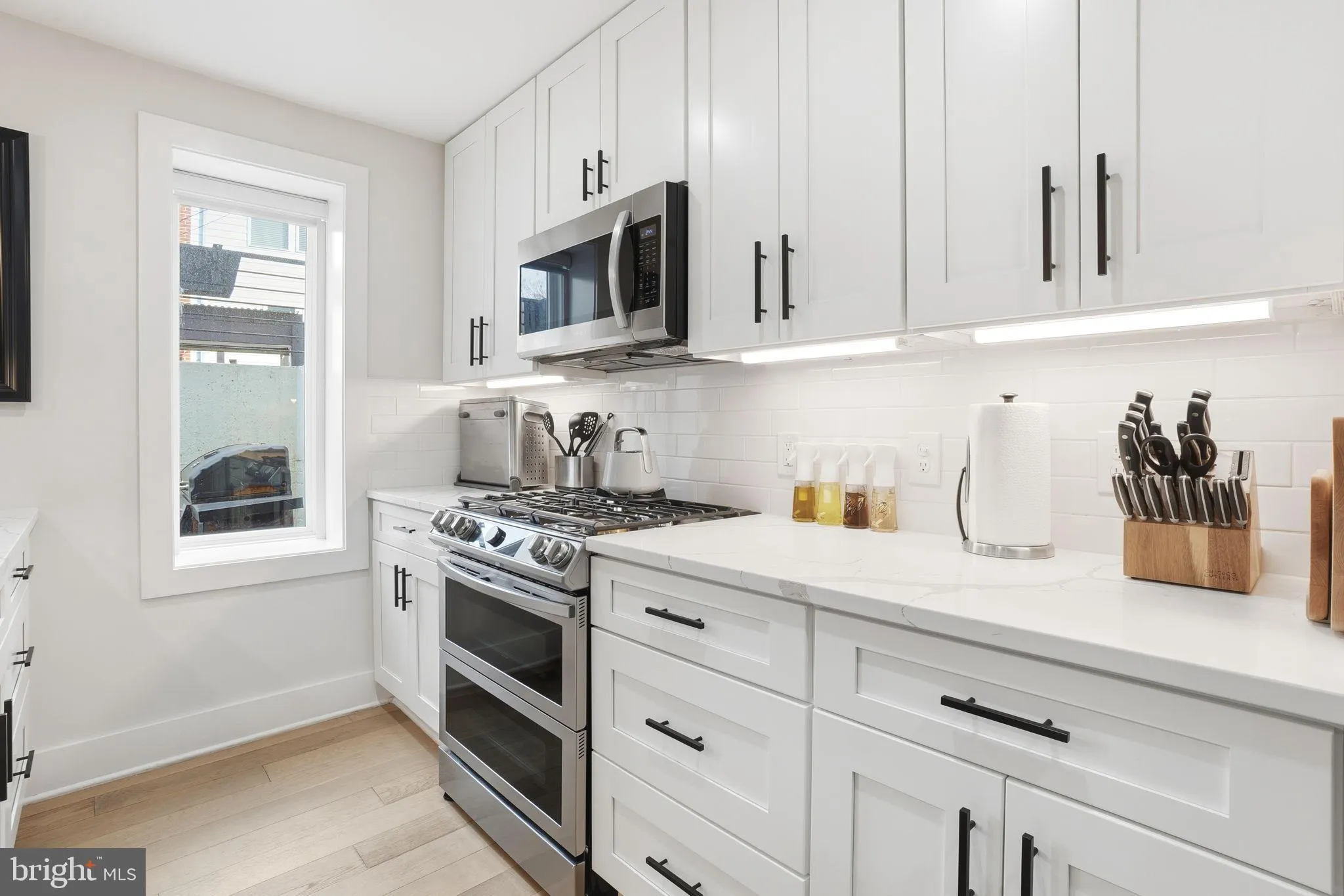 Every detail has been thoughtfully curated including custom-stained 5″ white oak flooring, recessed lighting, and modern fixtures throughout. The chef-inspired kitchen features quartz countertops, a full-height tile backsplash, white shaker cabinetry with soft-close doors and drawers, premium stainless steel appliances including a double oven, and waterfall quartz counters on the large breakfast bar, making it as functional as it is beautiful.