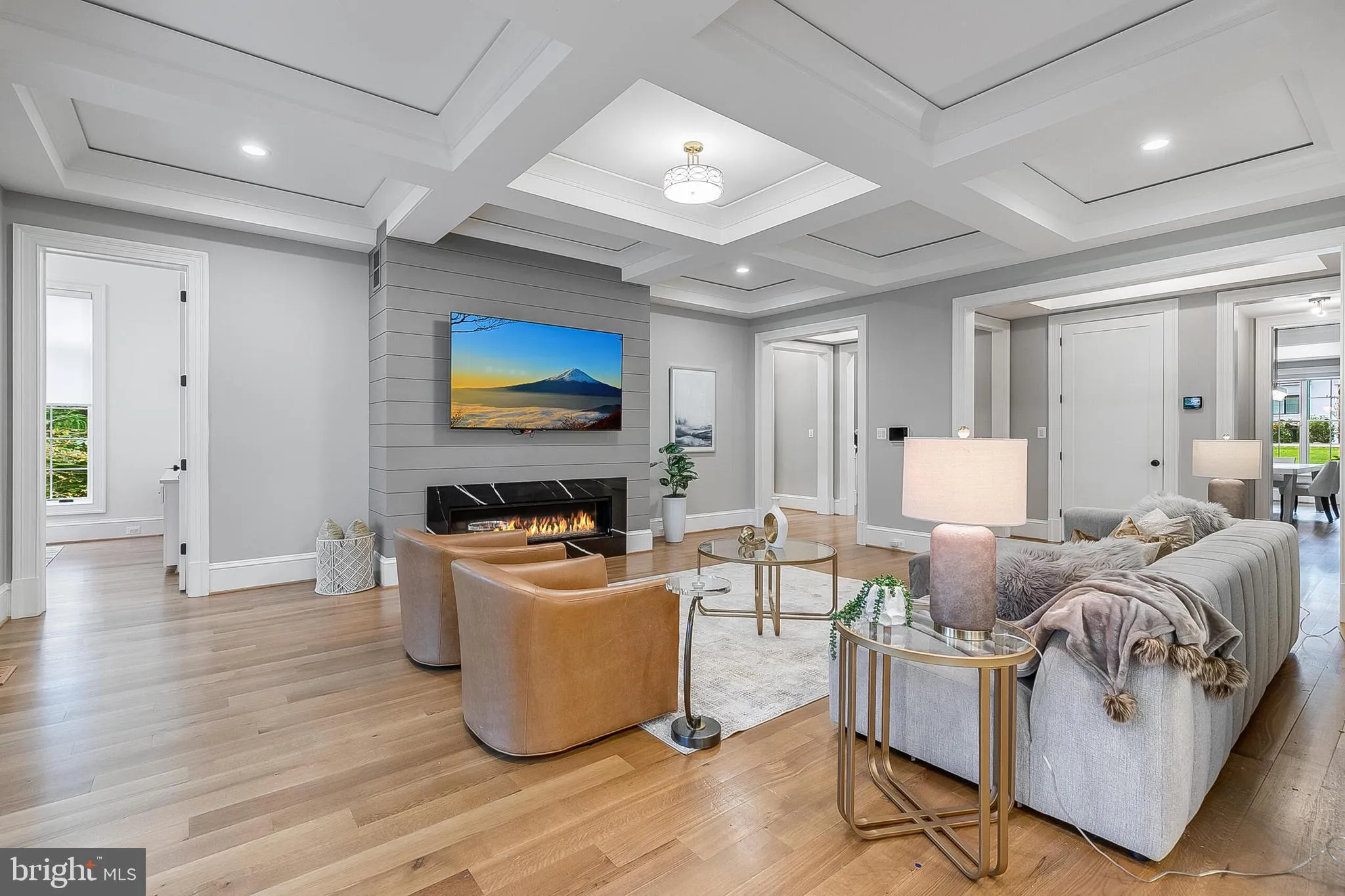 A welcoming foyer sets the tone with elegant formal living and dining rooms, while the breathtaking family room features a sleek fireplace and French doors that open to the expansive rear deck, which overlooks the private yard and includes a gas fire pit and a built-in gas line for grilling.