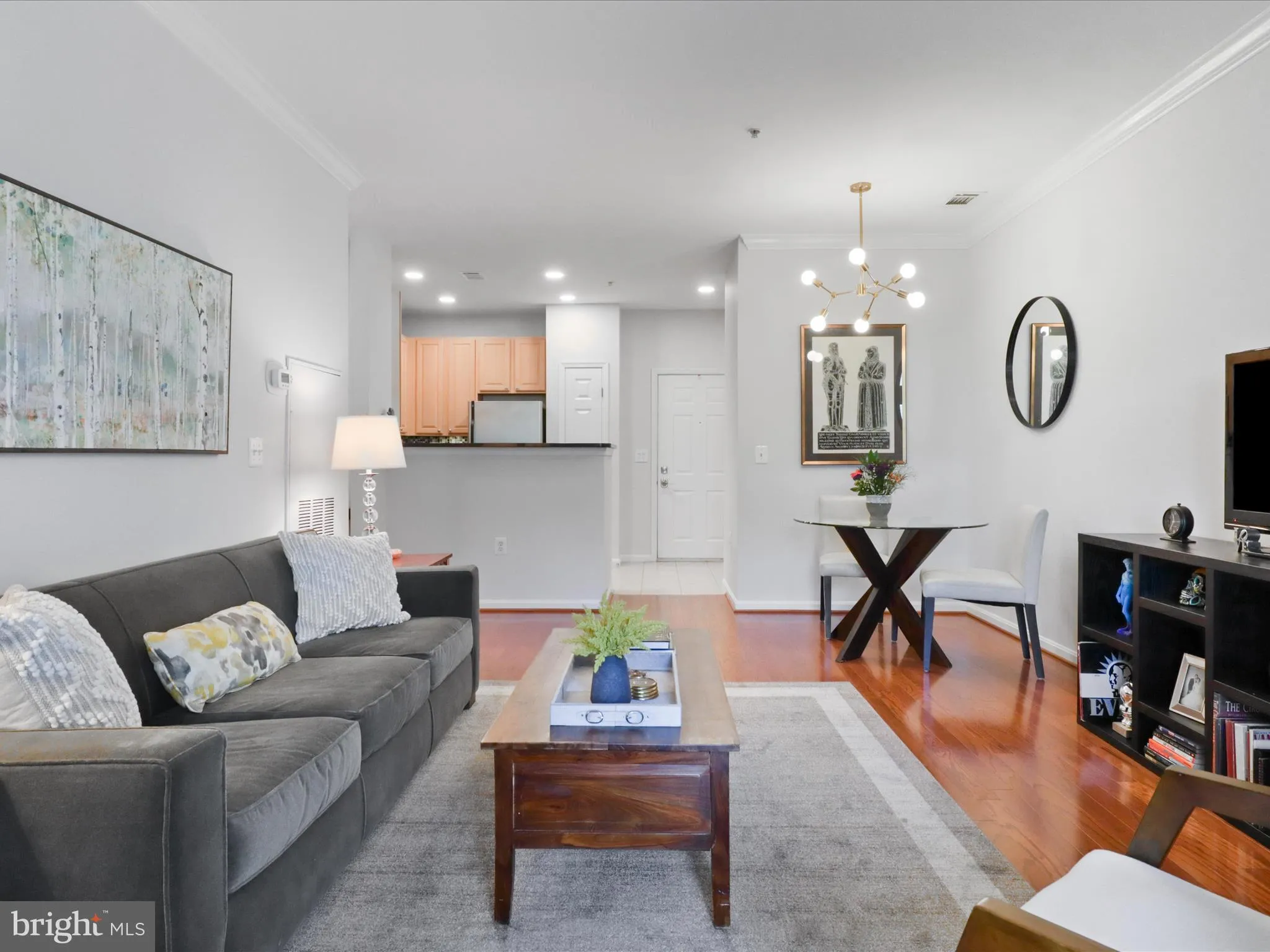 The open living area offers engineered hardwood floors, crown molding, and access to a private balcony. Perfect for morning coffee or relaxing in the evening! There’s ample room in the living area for a dining table, providing flexibility for both everyday living and entertaining.