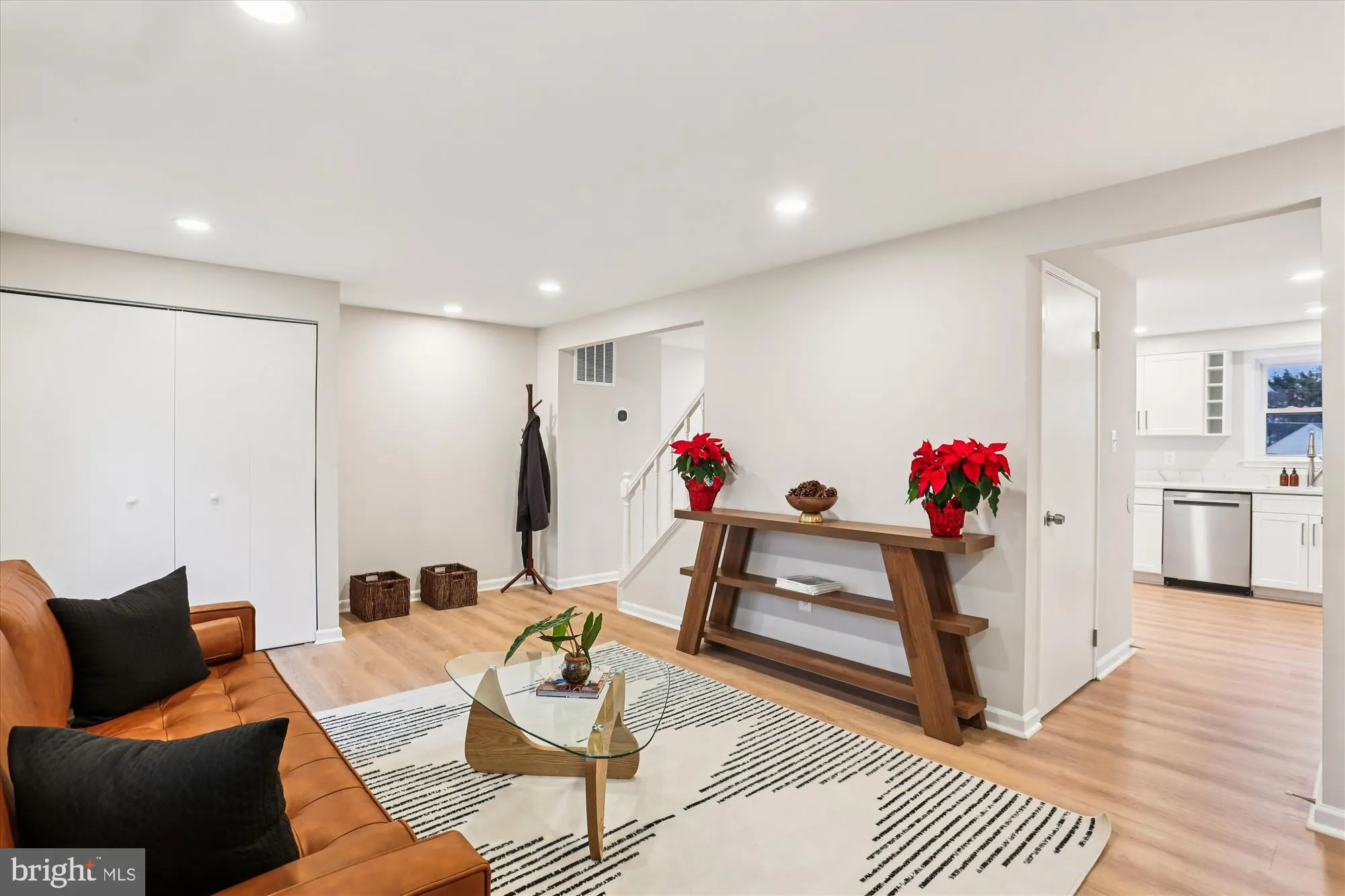 The bright main level features durable Lifeproof luxury vinyl plank flooring in warm Dusk Cherry tones, recessed lighting throughout, and an open flow ideal for everyday living and entertaining. The gourmet kitchen is the centerpiece of the home with white shaker cabinetry, Calacatta quartz countertops with a waterfall edge, and brand-new stainless steel Whirlpool appliances. A stylish half bath completes this level.