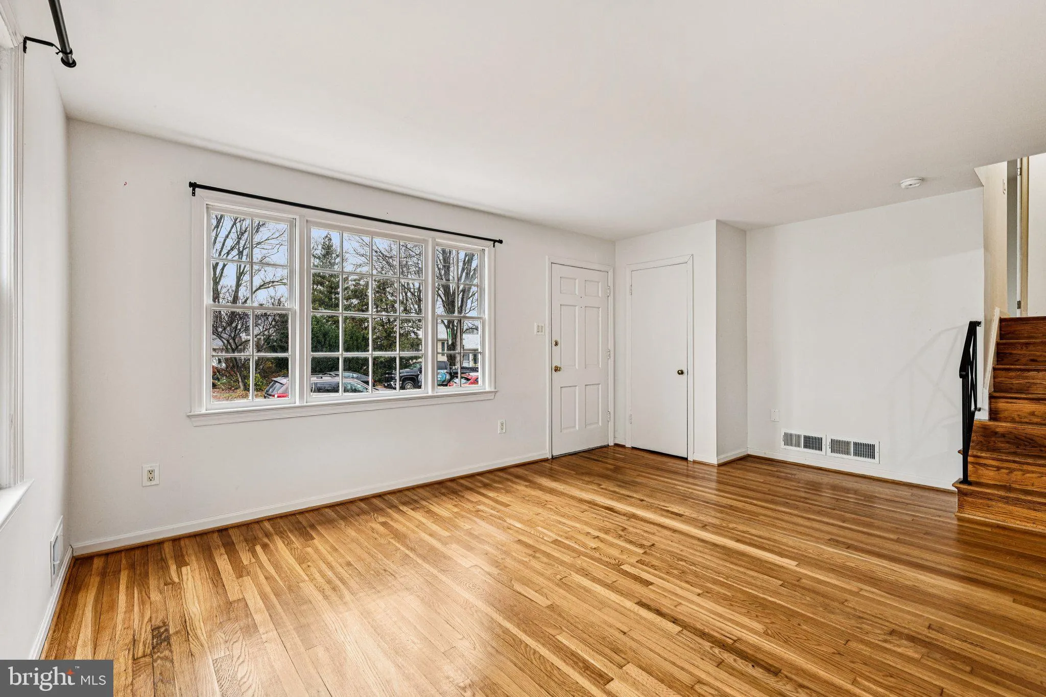 The upper level provides three bedrooms, all with hardwood floors, along with a full bath located near the primary bedroom. Storage is available through multiple closets across the upper hallway and bedrooms.