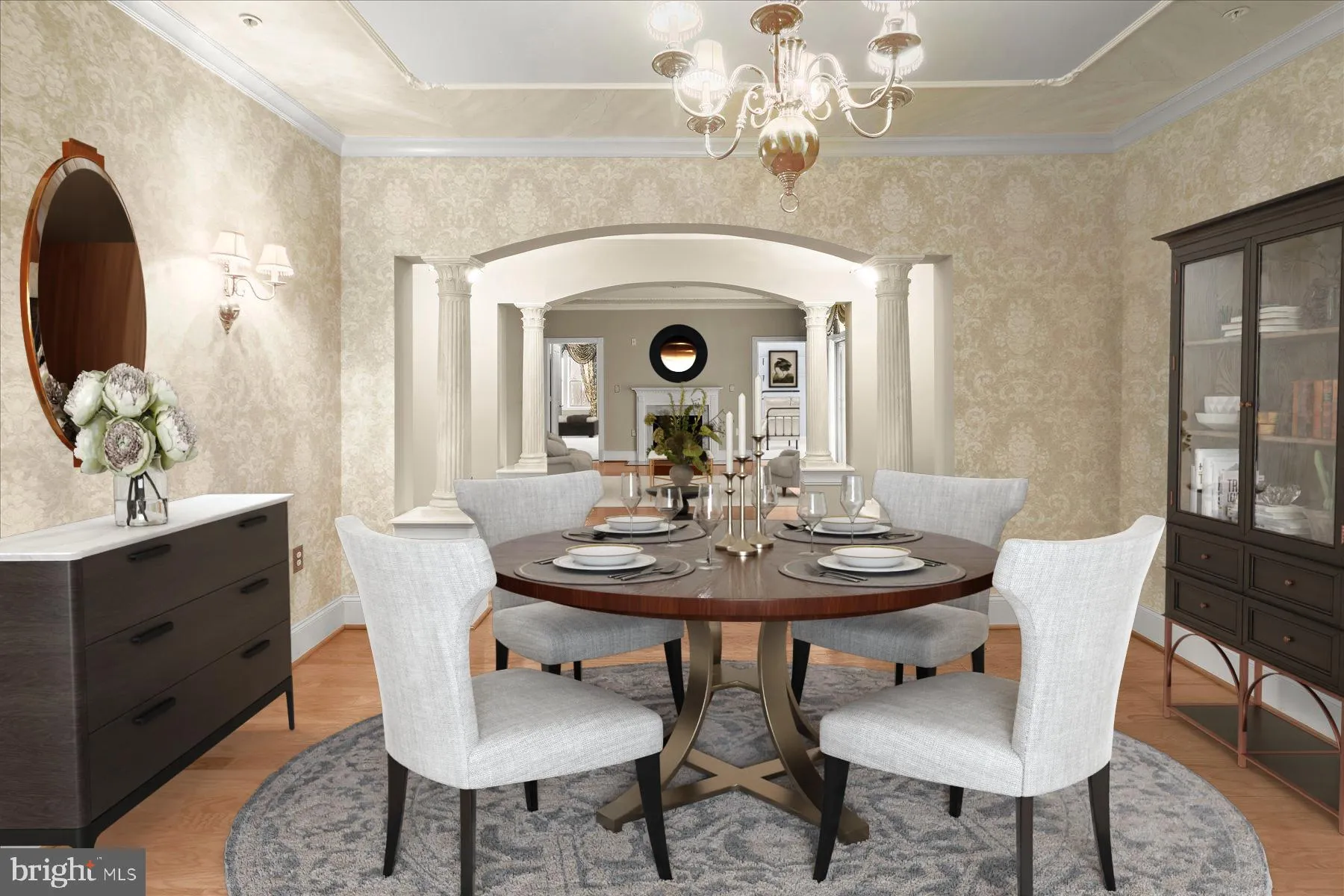 Welcome to 2250 Bear Den Road #104, a truly luxurious condo in the sought-after Park Place on the Tuscarora at Worman’s Mill, where exquisite details and thoughtful upgrades define every room. Rich hardwood floors, ornate millwork, stately columns, and classic moldings enhance the elegant living spaces. The welcoming foyer complete with a convenient powder room and coat closet opens to the formal living and dining rooms, beautifully framed by architectural columns. The living room features a cozy gas fireplace and access to a private balcony, while the dining room showcases timeless moldings that elevate every gathering.
