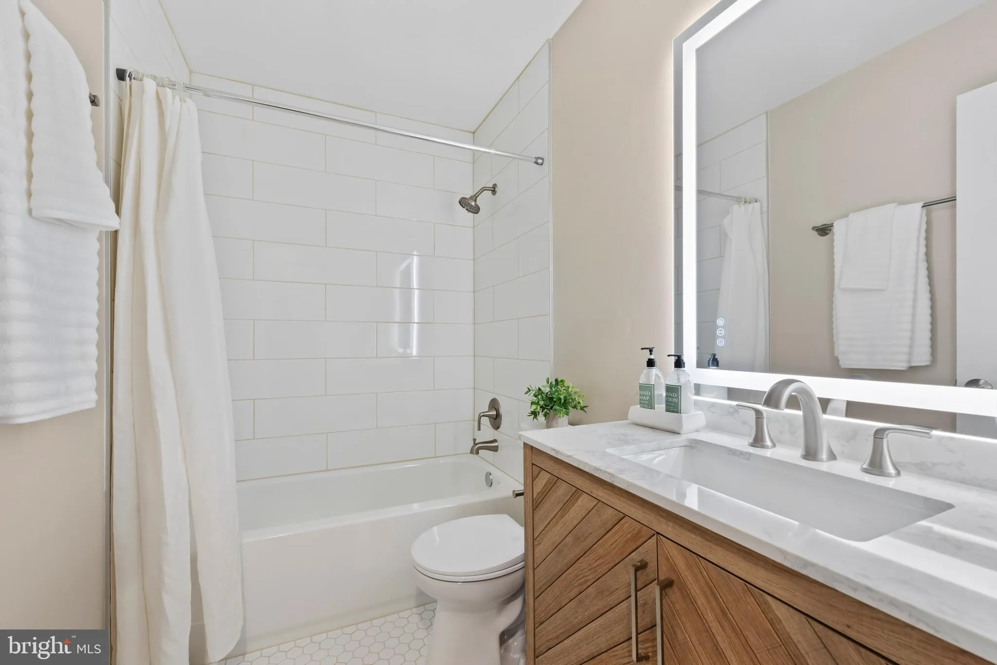 The spacious primary suite includes a massive closet plus an additional storage closet, and an updated en-suite bath featuring a walk-in shower and a sleek LED touch-activated mirror. The second bedroom offers great natural light and a generous closet, with the updated hallway bath just outside the door, complete with another LED mirror and a tub/shower combo.