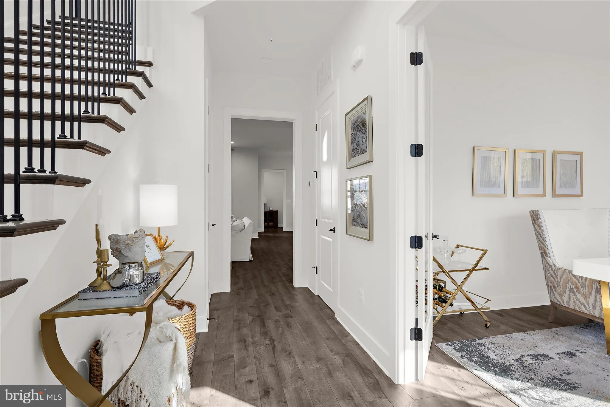 Step through the front porch and into a stunning foyer that sets the tone for the home. Adjacent to this graceful entryway, a sunlit study provides an inspiring space for work, play, or quiet retreat. Down the hall the open-concept living area is beautifully appointed with abundant natural light and a stunning gas fireplace. The kitchen makes a striking impression with an expansive center island offering seating for four, full-height cabinetry with soft-close features, quartz countertops, premium gold fixtures, Bosch appliances, double oven and butler’s pantry. The adjoining dining area complements the kitchen beautifully. Rounding out the main level is a half bath and mudroom, which provides interior access to the two-car garage and the fenced-in yard with a patio and grilling area. High-end LVP flooring extends across the main level and continues onto the second level, creating a sophisticated foundation throughout the home.