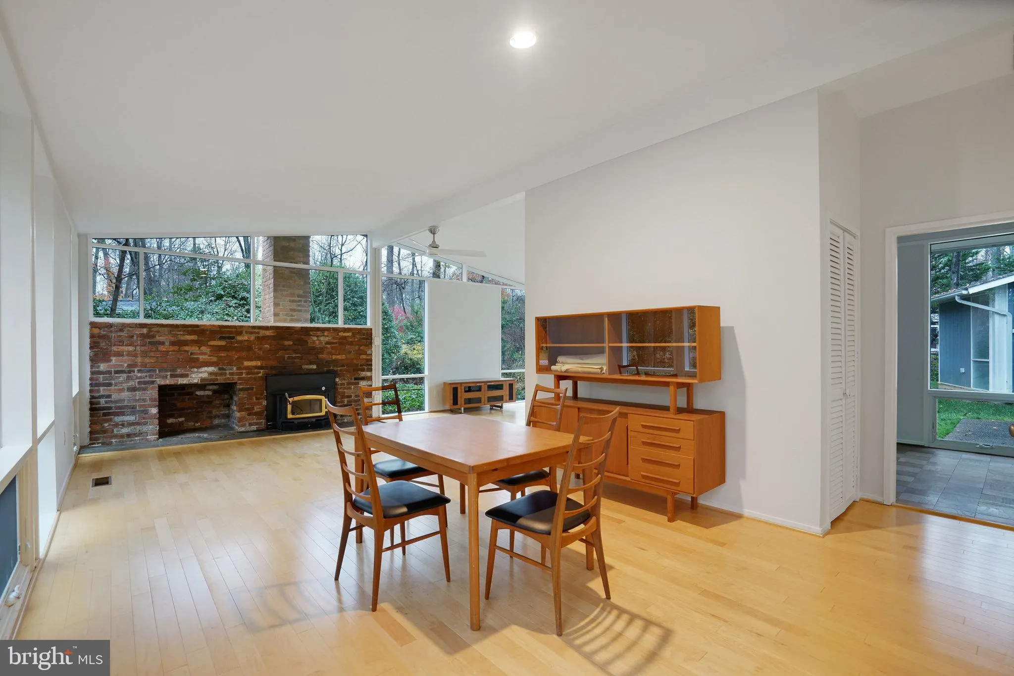 This one-level expanded Hollin Hills property is being sold as-is, yet is solid and well-maintained where it matters most. With excellent curb appeal, highlighted by clean architectural lines and simple landscaping, the home includes a rare 580 SF two-car garage addition discreetly hidden from the street and offering exceptional storage, studio potential, or workshop space. Inside the home, the space is airy and light thanks to vaulted ceilings and quality double-pane windows throughout, and features a layout that blends classic Goodman design with thoughtful expansions. The enlarged floor plan includes a family room/library with custom built-ins and a true primary bedroom suite complete with a modern bath, two walk-in closets, and direct access to the outdoors. The original portion of the home features an open living space and dining area with walls of windows and a cozy wood-burning stove, plus a kitchen with solid wood cabinets and space for a breakfast table. Two additional bedrooms and a full bath with tub complete the main living areas.