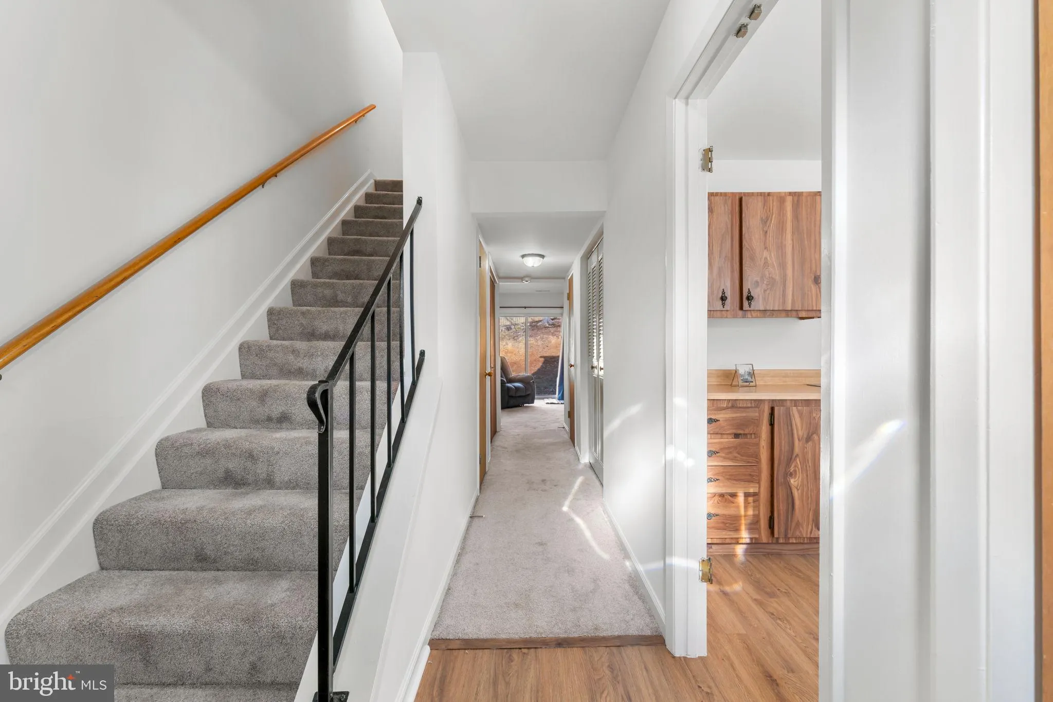 The main level features a spacious living room with sliding glass doors that lead to a private, fenced rear yard—perfect for relaxing or entertaining. The dining area flows seamlessly off the kitchen and living room, creating an open and inviting layout.