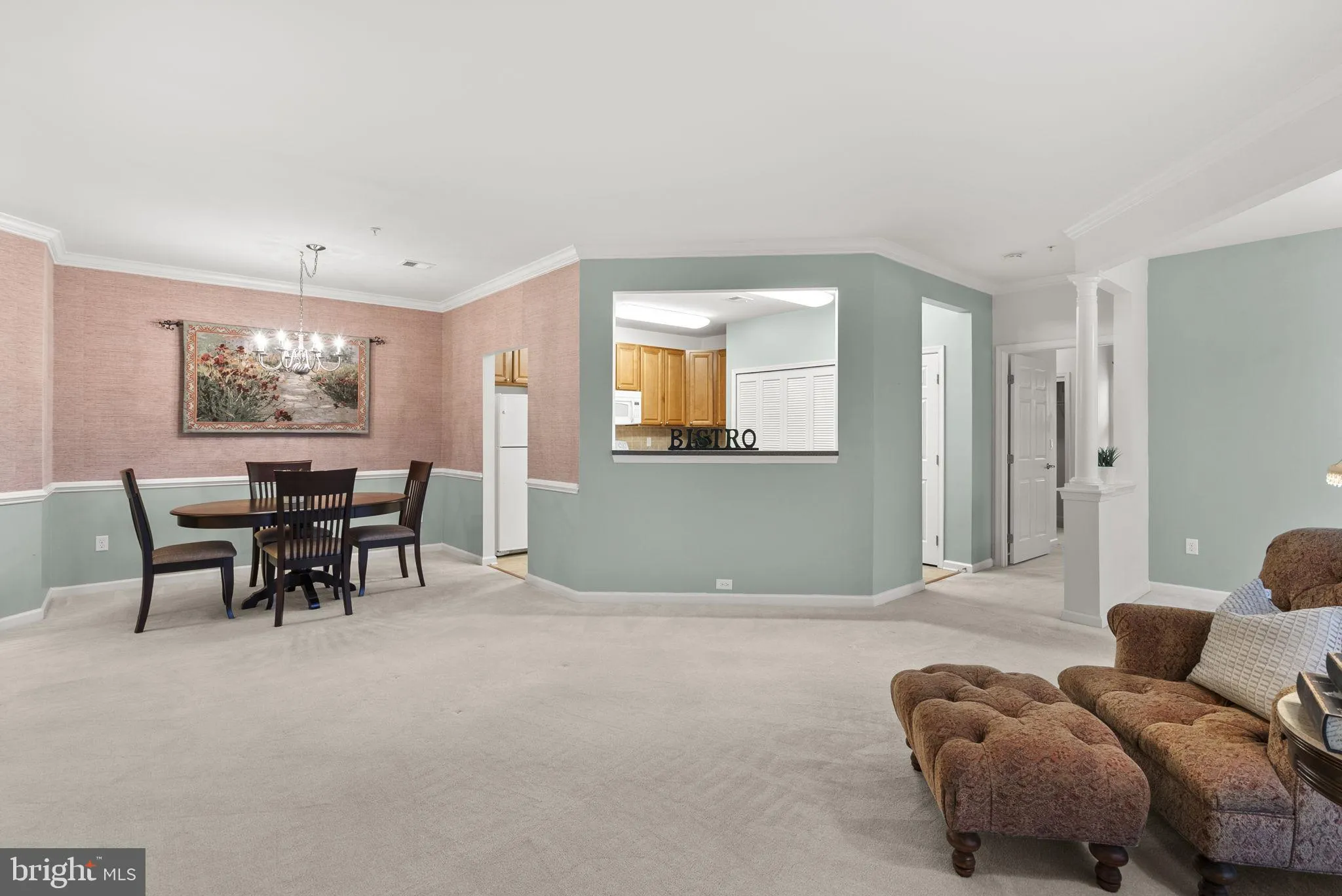 Inviting condominium offering 2 bedrooms, 2 bathrooms, and 1,330 finished square feet, located in the welcoming 55+ community of Legacy at Village Crest. Step inside to a bright, open-concept interior where plush carpeting flows through the combined living and dining areas. freshly painted. 3rd floor common storage unit to share with 3rd floor units. The spacious living room is filled with natural light, while the dining area is defined by chair railing and a beautiful chandelier. A charming den area, framed by elegant columns, offers a flexible space for reading or relaxing and provides access to the private balcony. The kitchen features upgraded countertops, a coordinating backsplash, ample cabinetry and counter space, a pantry, and open sightlines to the main living area, making it ideal for both everyday living and entertaining. The residence includes two well-appointed bedrooms and two full bathrooms. The primary suite offers a walk-in closet and a private ensuite bath with dual sinks, while the secondary bedroom features dual-entry access to the full hall bathroom for added convenience. Additional highlights include in-unit laundry and a private balcony, perfect for enjoying morning coffee or fresh air. Residents of Legacy at Village Crest enjoy access to a wide range of amenities, including indoor and outdoor pools, a clubhouse, tennis courts, a fitness center, and an on-site physical therapy facility.