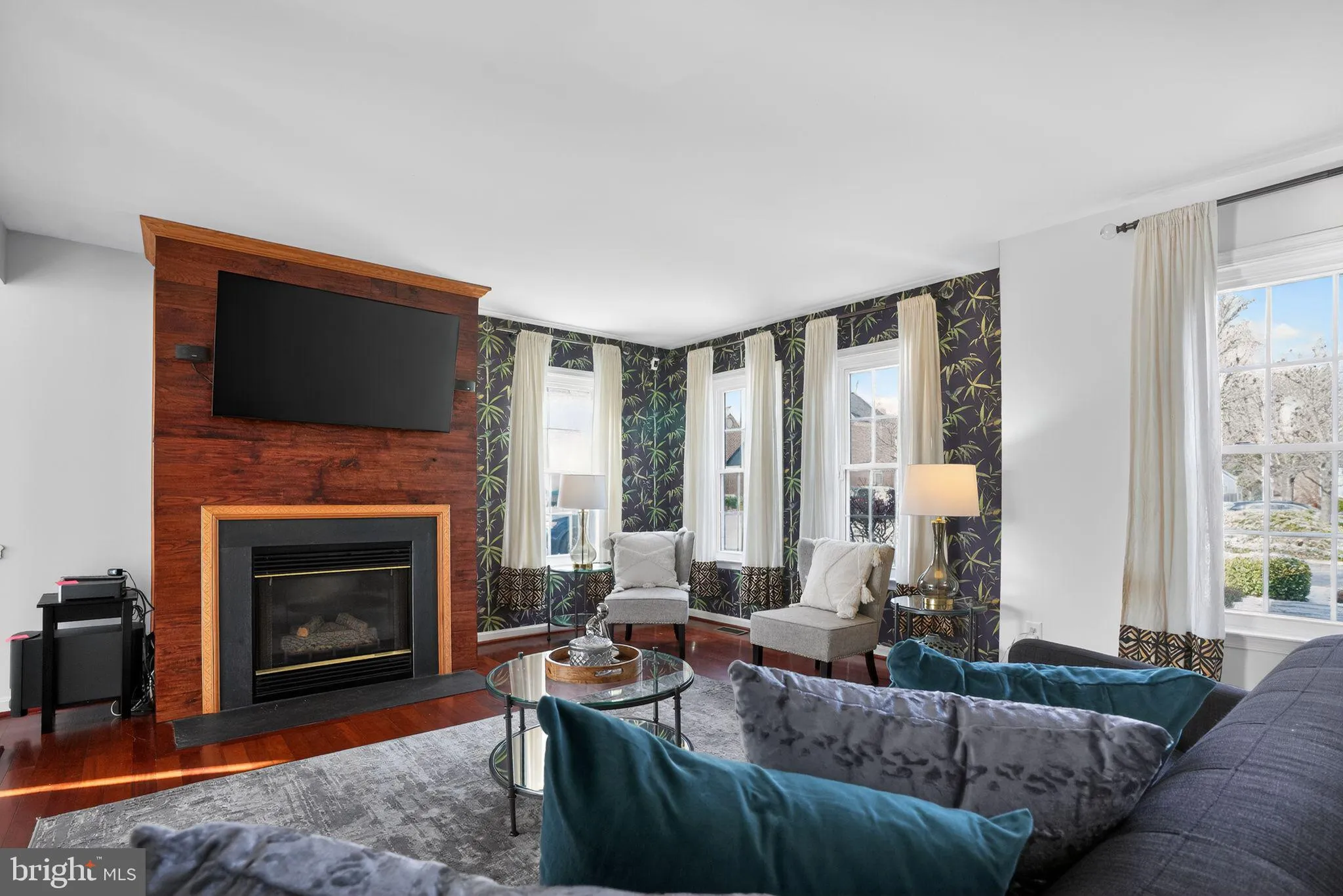 Once inside, you are greeted with a crystal chandelier and a large, double door coat closet. The foyer also has easy access to the one car garage. Step inside into the light filled living room, complete with a solid wood mantle over the electric fireplace. The space transitions seamlessly into the formal dining room finished with another crystal chandelier. The kitchen, complete with a dine-in area, features recently painted walls and cabinets, Bosch dishwasher, under the sink water filtration system, and copper tile backsplash. Sliding glass doors with internal blinds lead outside to the repainted hardwood deck, with ample space for grilling and an outdoor living space. A powder room is conveniently located on the main floor hall.