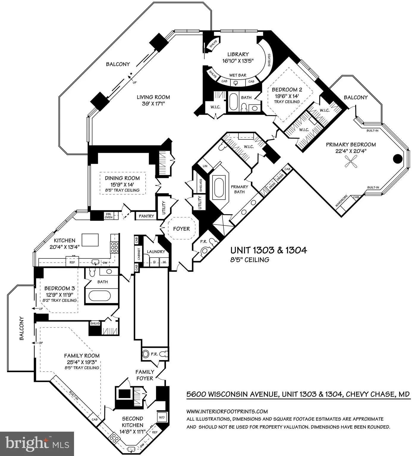 This impressive floor plan thoughtfully combines two residences to total 4,040 sq ft, featuring three balconies and beautiful views to the east, south, and west. The floor plan tab shows three bedrooms, including a large primary suite with a spacious bath, a custom wood-paneled library, a separate family room, a big kitchen with an island, a smaller second kitchen, and three full baths and two half baths. From the grand foyer, enter the spectacular formal living room that opens to a wraparound balcony, next to the library and formal dining room. The second bedroom has a walk-in closet and an ensuite bath. The primary suite offers a generously sized bedroom with a sitting area and built-ins, two walk-in closets, a dressing area, and a spa-like bath with dual sinks, a separate tub, and a shower. At the other end of the condo, you’ll find the third bedroom with its own bath, a gracious family room with built-ins and a third balcony, and the second kitchen with a laundry closet.