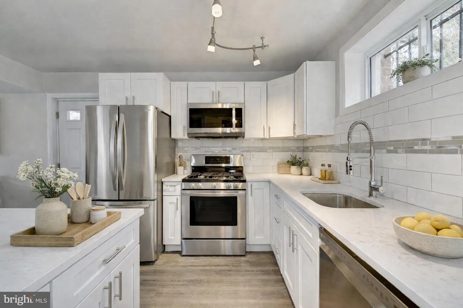 Inside, nearly 2,500 square feet unfolds in a way that feels both open and grounded. The main level is bright and welcoming, with an easy flow between living and dining spaces that works just as well for everyday life as it does for hosting friends. The kitchen is the heart of the home, featuring sleek quartz countertops, classic white shaker cabinetry, stainless steel appliances, and a warm wood-slat island that invites lingering conversations and casual meals.