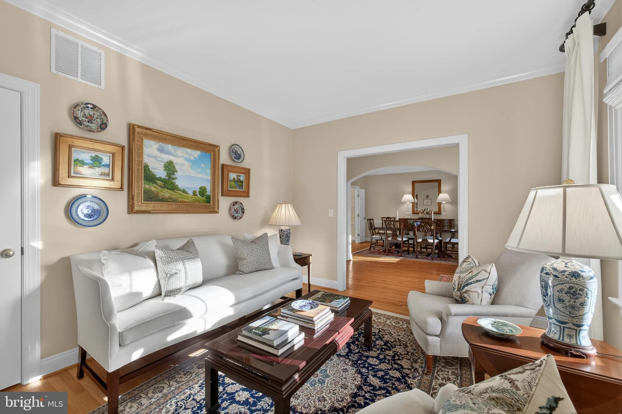 From the wide front porch, one enters the spacious and inviting foyer; it is here where one sees the wonderful openness of this mostly traditional floor plan. To the right is the formal dining room, to the left the elegant living room and straight ahead, the foyer opens into the dramatic family room with wood burning fireplace and vaulted ceiling. The ceiling height, updated statement lighting, as well as the tall windows flanking the fireplace, add to the ambiance.