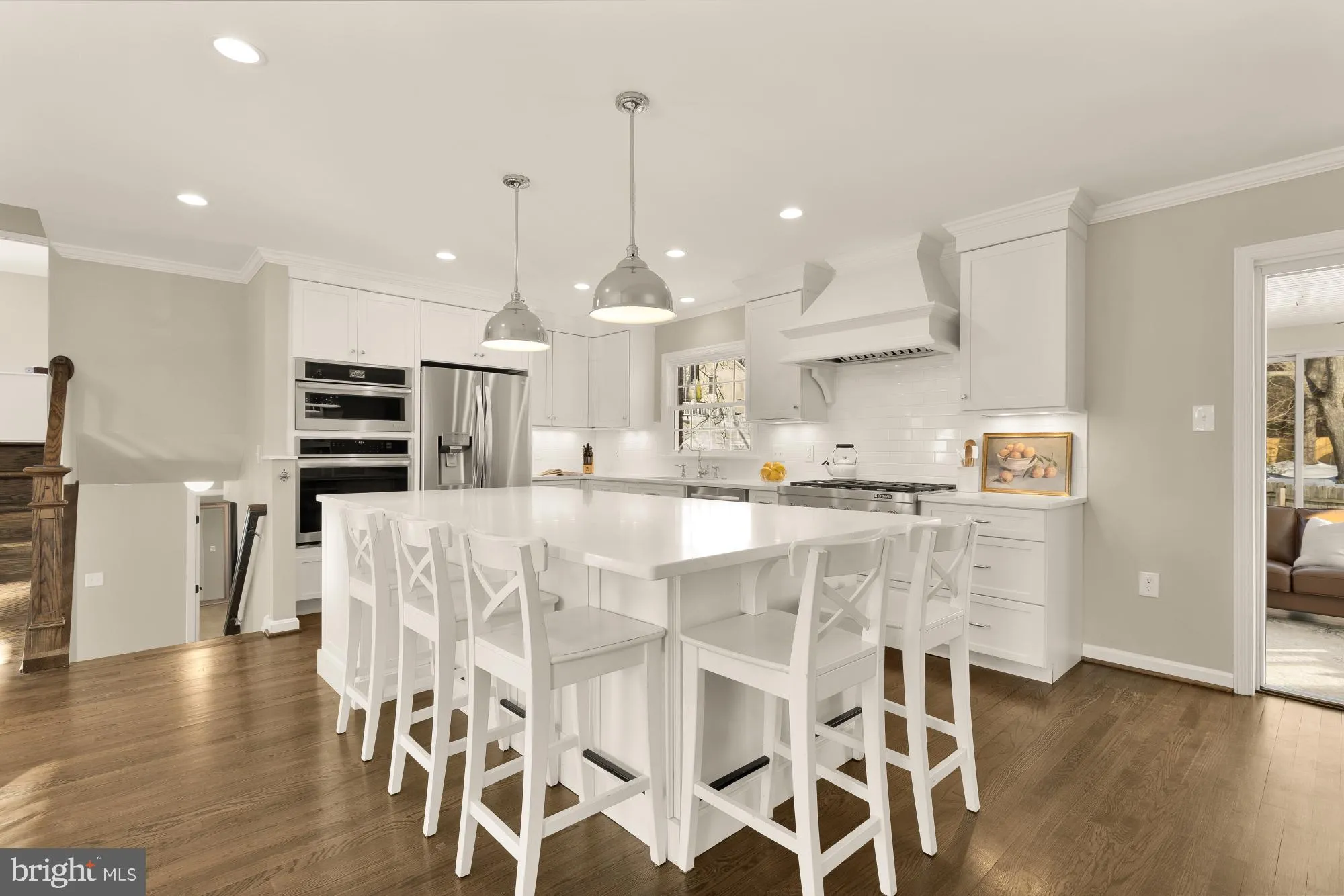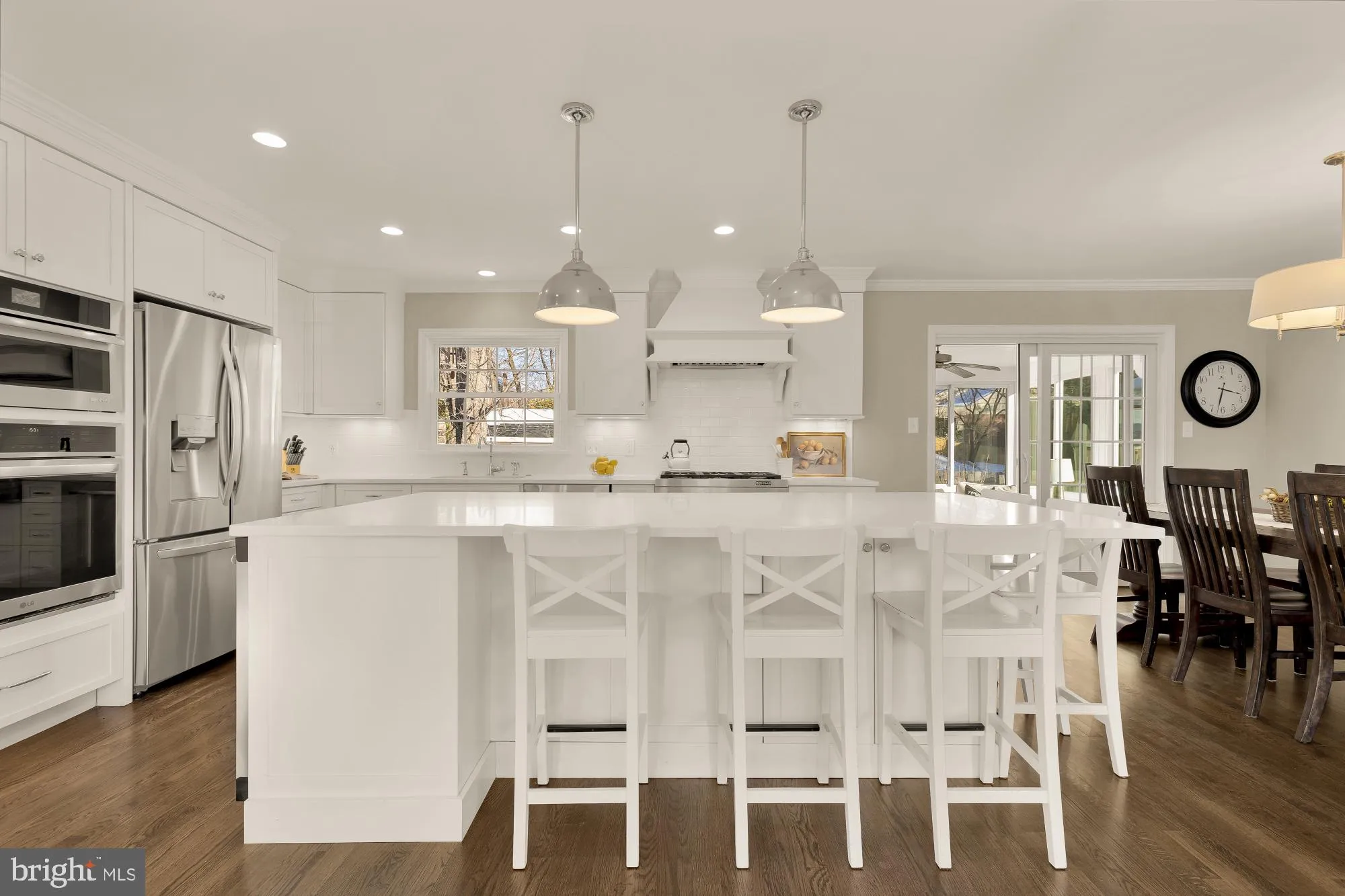 The main level showcases gorgeous hardwood floors and an open-concept living space ideal for both everyday living and entertaining. The stunning kitchen features custom white cabinetry, quartz countertops, a large island with seating for five, and a generous dining area that flows seamlessly into the family room. High-end appliances include a JennAir cooktop, custom range hood, and an integrated beverage refrigerator, along with a new refrigerator (2023). A sliding glass door off the kitchen opens into a fully insulated, heated and cooled four-season sunroom, surrounded by three walls of windows that fill the space with natural light.