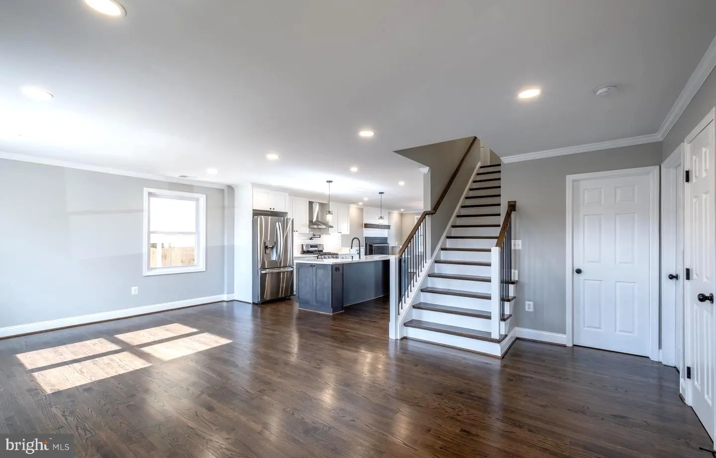 The main level features a bright, open living, dining, and kitchen layout that flows seamlessly to the fenced backyard, creating an easy indoor-outdoor lifestyle. The gourmet kitchen is fully updated with stainless steel appliances, quartz countertops, tile backsplash, pot filler, pantry, and a large center island perfect for gathering. This level also includes hardwood floors, recessed lighting, crown molding, a wood burning brick fireplace, powder room, private office with French doors, and a generously sized main level bedroom with a full bath.