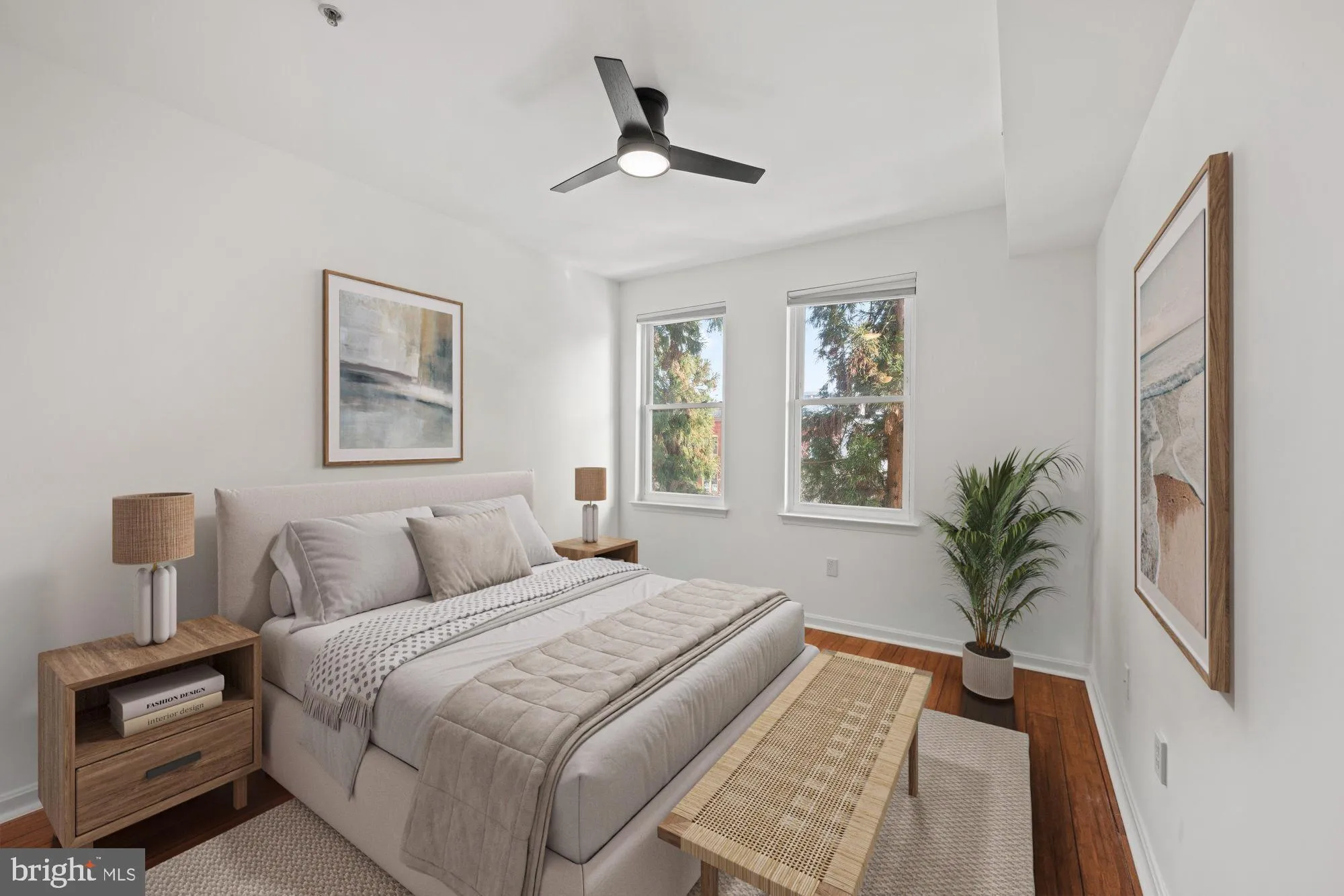 The spacious living and dining area is anchored by wide-plank flooring and large windows that fill the space with natural light. A renovated kitchen features sleek cabinetry, stone countertops, stainless steel appliances, and ample storage—perfect for home chefs and casual gatherings alike. Both bedrooms are generously sized, with the primary suite offering a spa-like en-suite bath and excellent closet space. A second full bathroom, also fully updated, provides flexibility for guests, a nursery, or a home office setup.