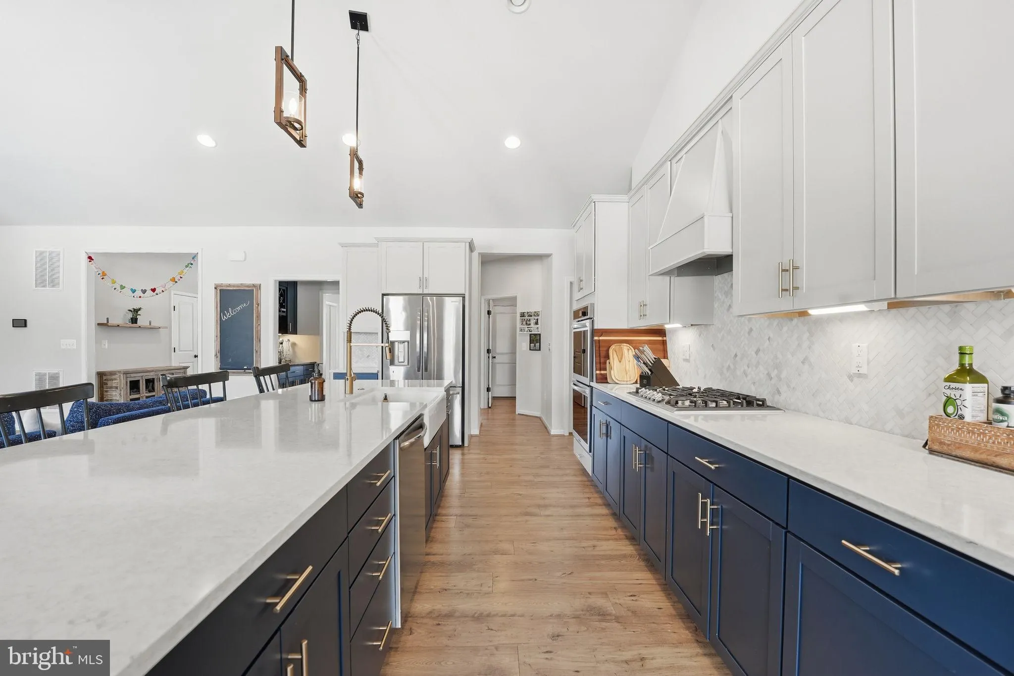 The living room is highlighted by soaring vaulted ceilings and a striking stacked stone fireplace, creating a warm yet dramatic focal point. Recessed lighting is thoughtfully incorporated throughout the home, enhancing the open layout and refined ambiance. The gourmet kitchen is designed to impress, offering an ideal balance of beauty and functionality for both casual living and elevated hosting.