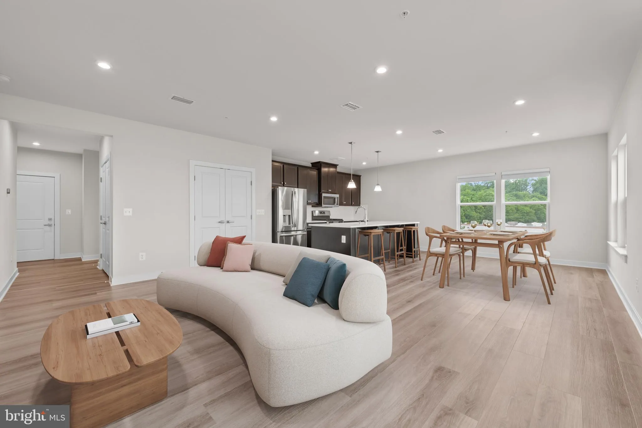 Situated on a corner floor, the home is filled with abundant natural light from multiple exposures, creating a bright and open atmosphere throughout. The unit also enjoys enhanced privacy, as its walls are thoughtfully separated from neighboring residences by stairwells and common hallways rather than directly adjoining units—providing a noticeably quieter living experience. The contemporary open layout is anchored by a stunning kitchen featuring large quartz countertops, a spacious eat-in island, 42-inch custom cabinetry, and top-tier stainless steel appliances. The home is equipped with modern HVAC and a tankless hot water heater, all less than three years old, offering both efficiency and peace of mind.