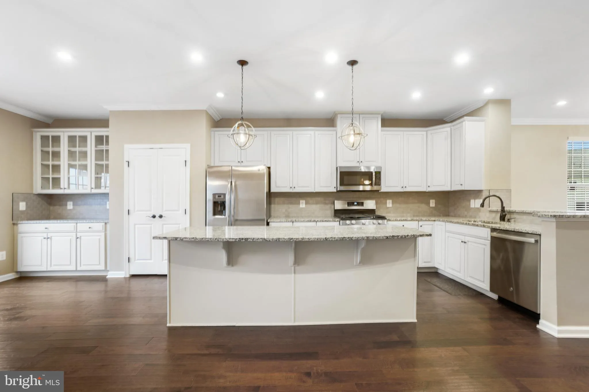 Welcome to this brick-front townhome in the desirable Potomac Shores community! This three-level home offers over 2,500 square feet of well-designed living space. The main level features an open layout with a family room, dining area, and a bright kitchen with a large island, granite countertops, stainless steel appliances paired with crisp white cabinetry. Step out onto the deck for outdoor enjoyment, and enjoy the convenience of a main-level powder room.