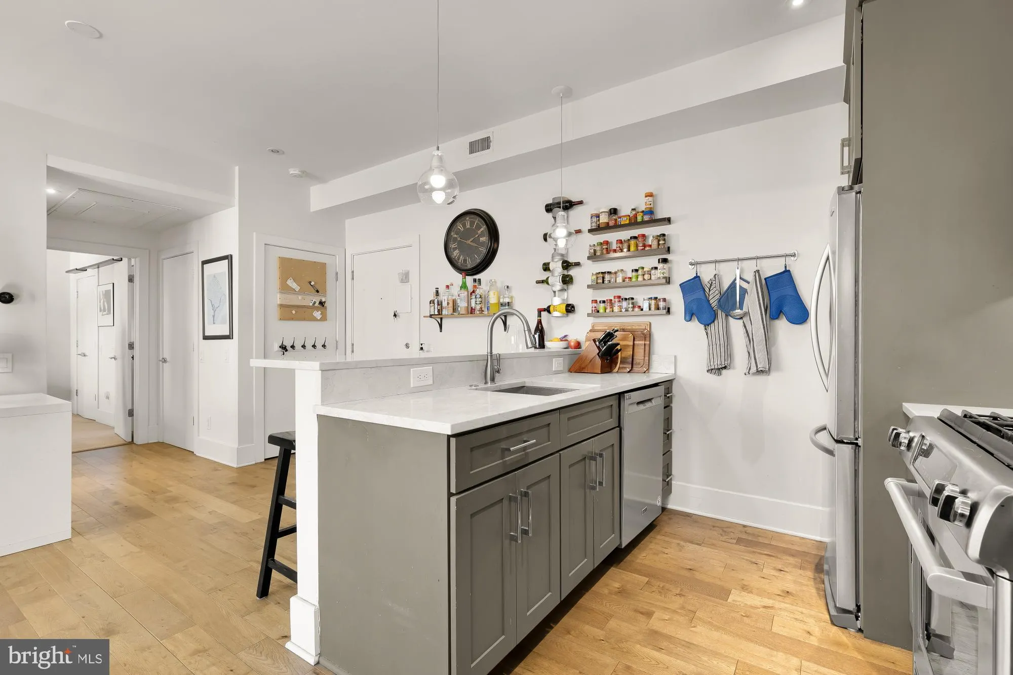 Lifestyle and elegance come together in this premium top-floor, one-bedroom, one-bath condominium located in one of Porter Street’s classic 1923 Beaux Arts buildings in the heart of historic Cleveland Park. Wrapped in windows, this sun-drenched residence offers bright, open living spaces and peaceful, leafy views that feel like a true urban retreat. The open-concept living, dining, and kitchen area is ideal for both everyday living and entertaining. The gourmet kitchen features custom cabinetry, marble countertops and full-height backsplash, premium stainless steel appliances, a gas cooktop, built-in microwave, and counter-height seating for casual meals. The spacious bedroom easily accommodates a king-sized bed and includes two walk-in closets. Just outside the bedroom, the spa-like bathroom is finished in white marble with sleek cabinetry and a glass walk-in shower with a rain showerhead. Hardwood floors run throughout the home, adding warmth and character, and a newly installed HVAC system (2024) along with an in-unit stacked Bosch washer and dryer with additional storage completes the interior. One of the standout features of this home is the exceptionally large private fenced patio, perfect for entertaining or relaxing outdoors. The patio has a built-in outdoor kitchen, gas grill, and refrigerator. Additional conveniences include an ASSIGNED PRIVATE PARKING SPACE, private motorcycle/bike parking, and a separate storage unit. Adams Terrace is a pet-friendly, boutique condominium offering amenities such as Amazon lockers for secure package delivery. Ideally located just off Connecticut Avenue, the building is steps from the Cleveland Park Metro, Library & neighborhood favorites like Cactus Cantina, Medium Rare, Nanny O’Briens, Coldstone, 2Amys, and Dakshi, and surrounded by nearby parks including the Rosedale Conservancy.