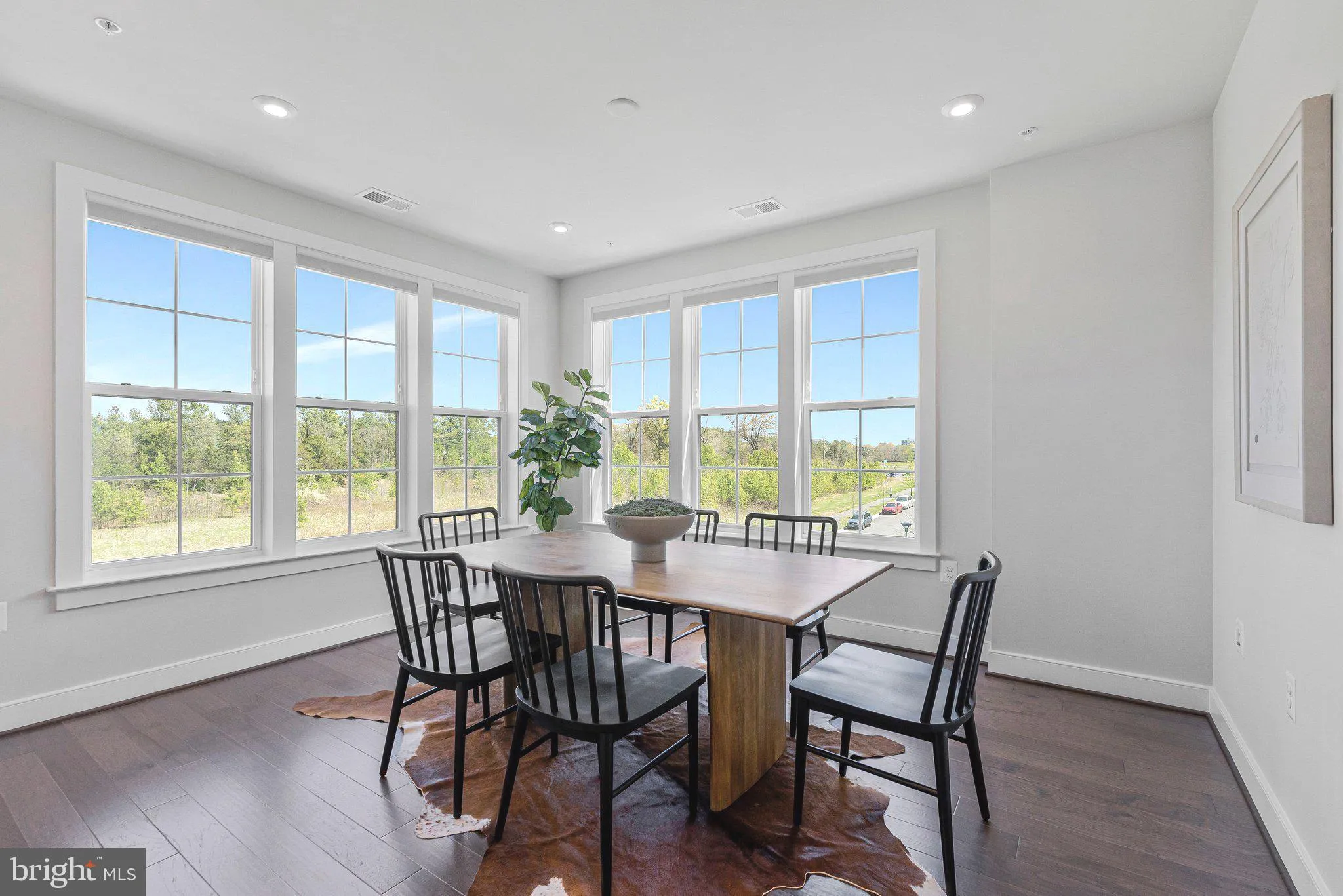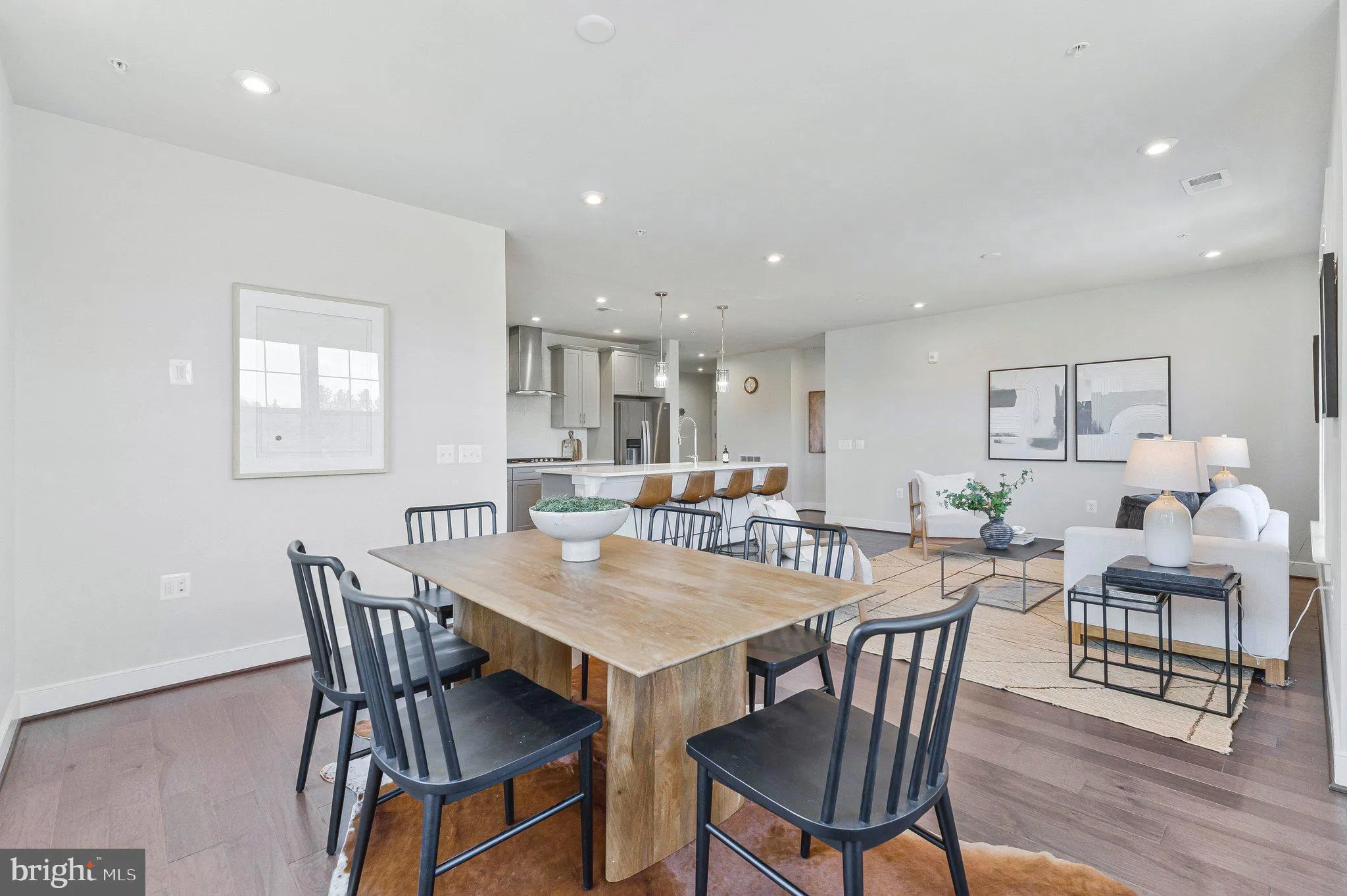 Welcome to this like-new, elegant, and contemporary corner condominium offering the ease of single-level living with a bright open-concept design. Located in a well-maintained, access-controlled building just minutes from the Innovation Center Metro Station, this home perfectly combines comfort, sophistication, and everyday convenience in one thoughtfully designed space. Perched on the 3rd floor with desirable south and east exposures, the unit is filled with natural light and enjoys open views of the surrounding green space. Inside, the seamless layout features wide-plank hardwood flooring in the main living areas, plush carpeting in the bedrooms, and refined finishes throughout. At the heart of the home is a stunning chef’s kitchen showcasing a massive quartz island that comfortably seats four, 42-inch beautiful light grey shaker soft-close cabinets, stainless steel Whirlpool appliances, and a sleek modern backsplash that brightens the space. The adjoining living and dining areas flow effortlessly, creating an ideal setting for both relaxing and entertaining.