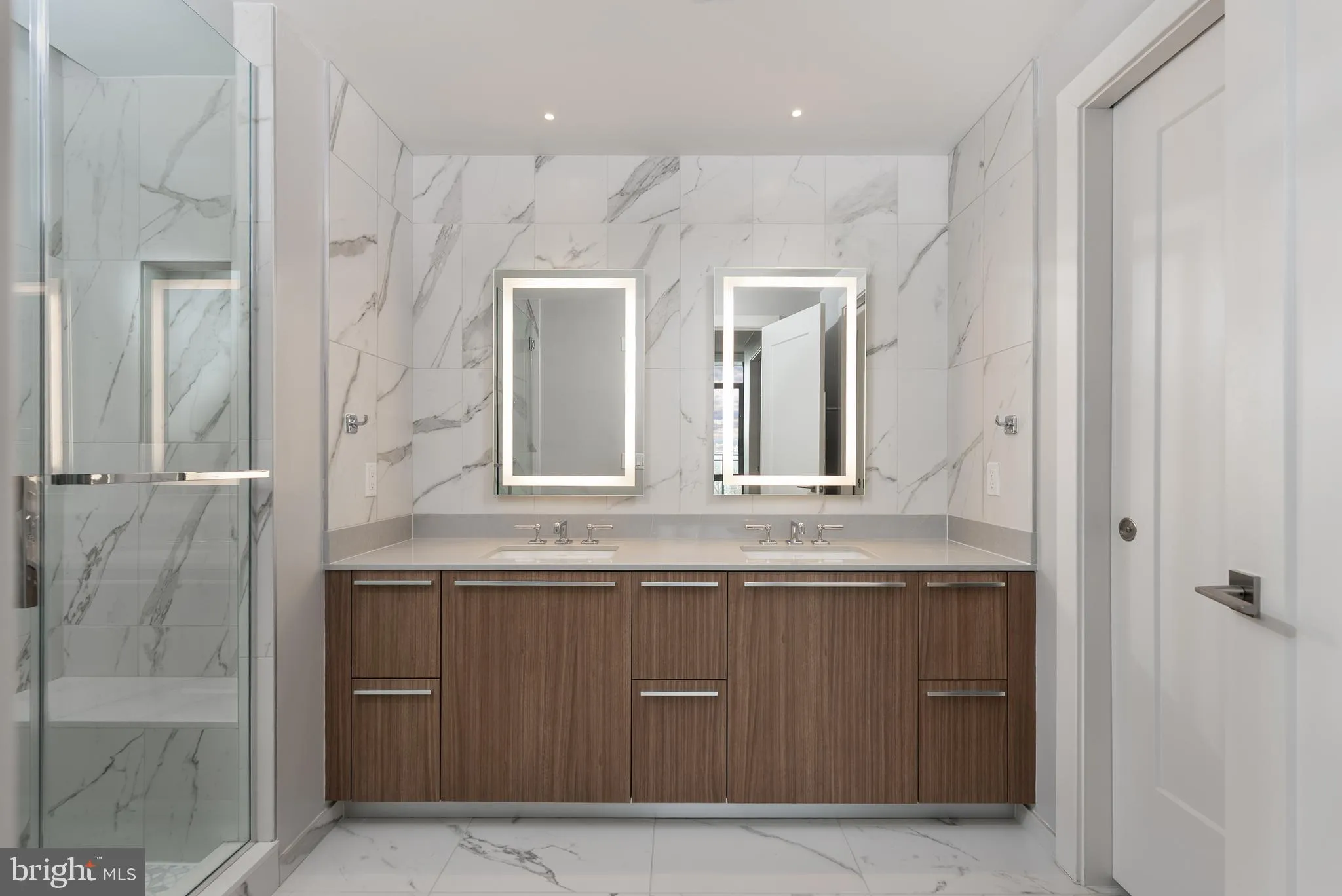 Unwind in the private primary suite, highlighted by great views, two custom walk-in closets, and a spa-inspired bath featuring a dual-sink vanity, LED backlit mirrors, and tile extended to walls. The spacious second bedroom with walk-in closet is situated on the opposite side of the home, increasing privacy in both bedrooms. Additional full bath, laundry room, and custom built desk nook with Snaidero cabinetry complete the home.