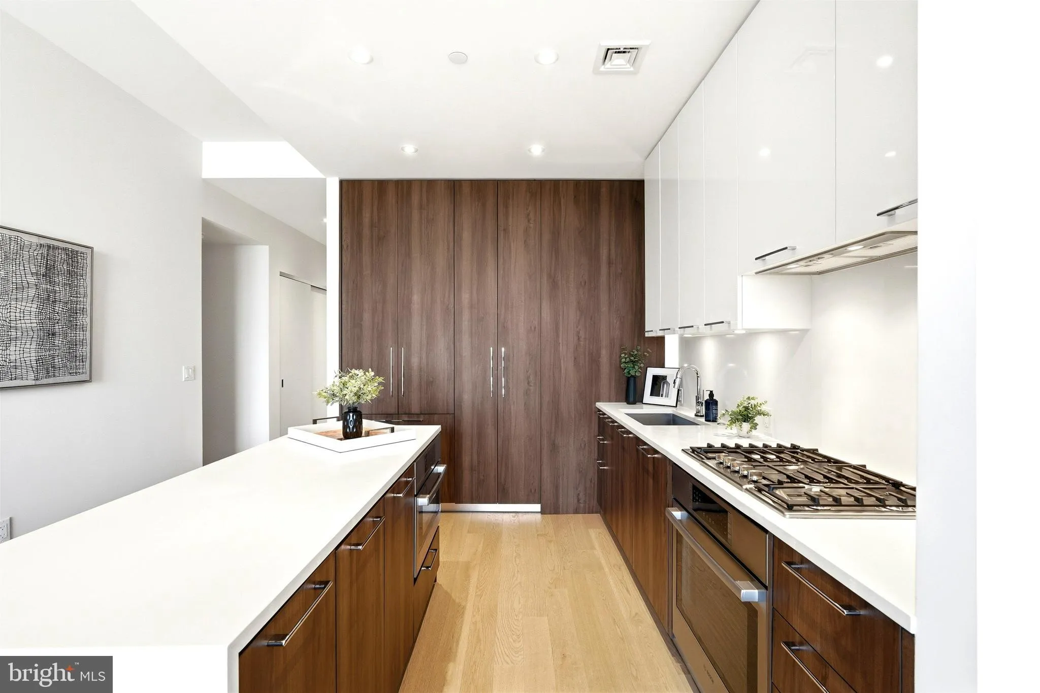 The open layout feels expansive with soaring 10-foot ceilings and contemporary finishes. The designer kitchen blends style and function with custom cabinetry, composite stone countertops, and a dramatic waterfall-edge island with seating and extra storage. Premium appliances include a five-burner gas cooktop with wall oven, concealed refrigerator and dishwasher, built-in microwave, and full-height pantry. Brand new washer inside the unit (installed 2026).
