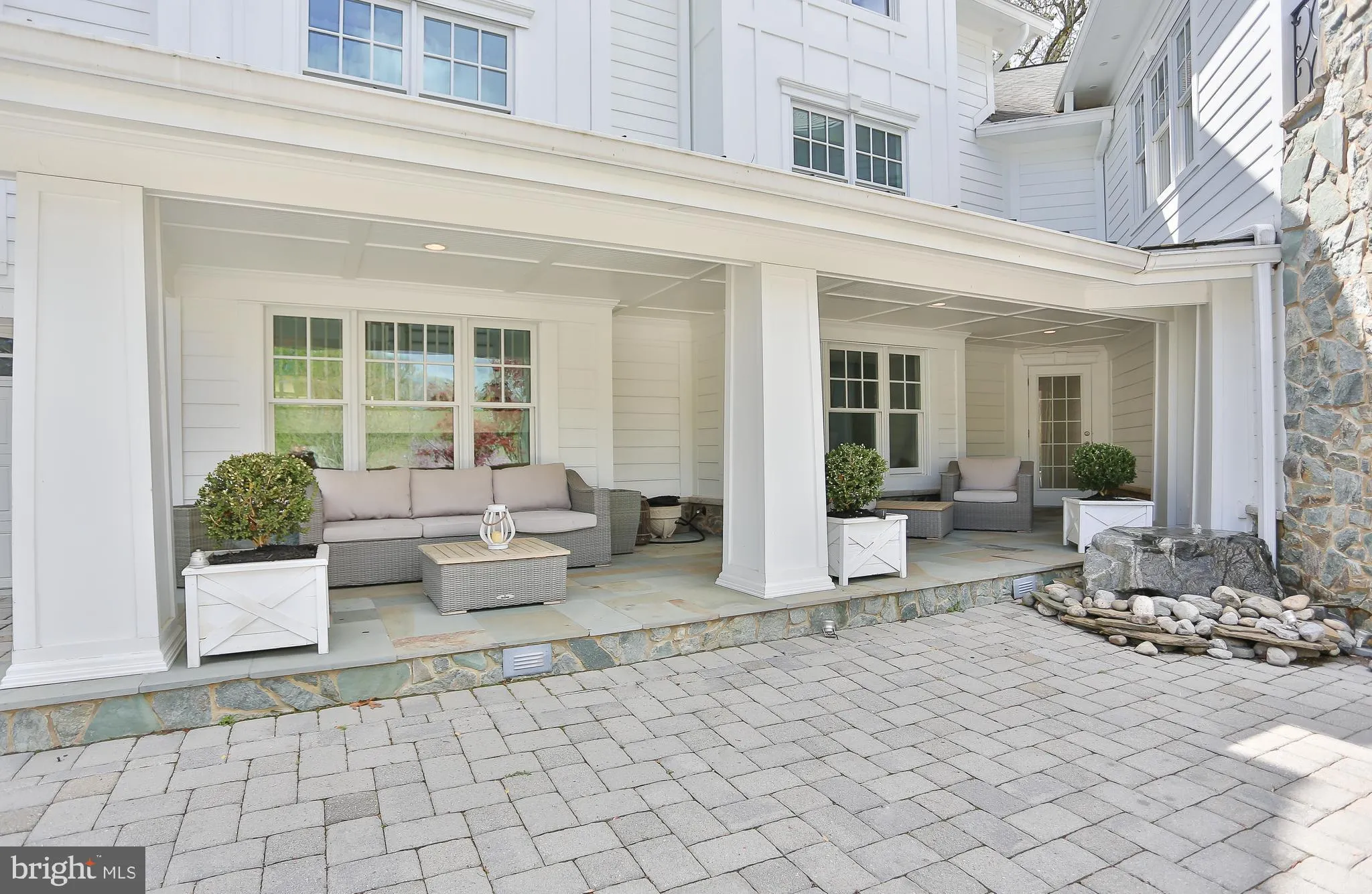 The front yard is equally impressive with a paver driveway, a spacious front porch, and double entry wrought iron door.