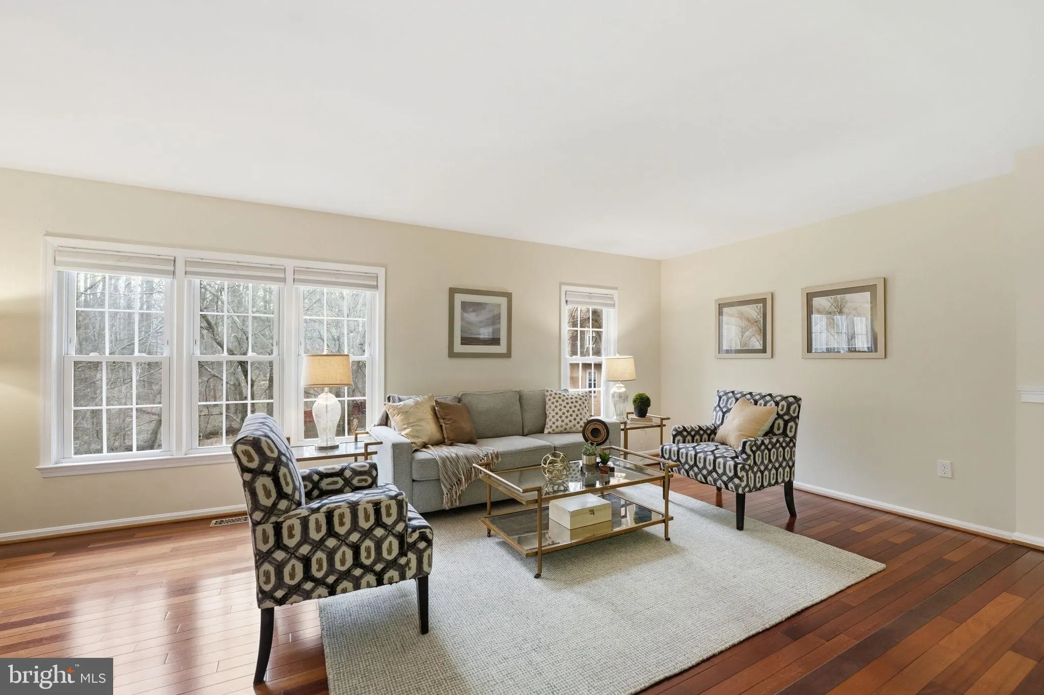 The light-filled main level features a spacious living room with double-pane windows overlooking the trees, seamlessly flowing into a generous dining area highlighted by a chic farmhouse chandelier, ideal for both everyday living and entertaining. The kitchen is thoughtfully designed with white cabinetry, stainless steel appliances, granite countertops, and space for a casual dining table by the window.