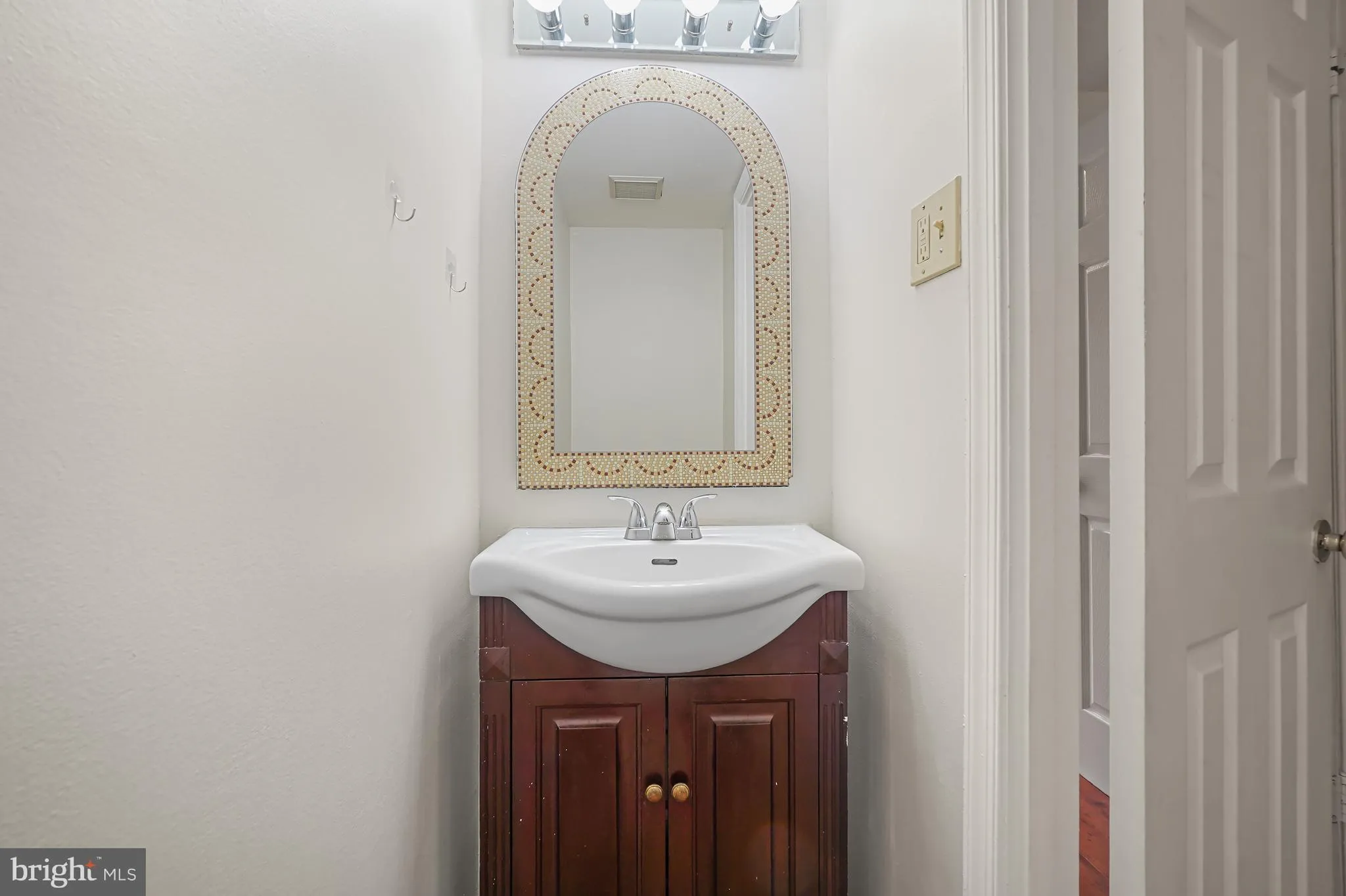 The eat-in kitchen overlooks the dining area and features beautiful hardwood flooring, abundant cabinetry, and workspace for cooking and meal prep. A convenient powder room completes the main level.