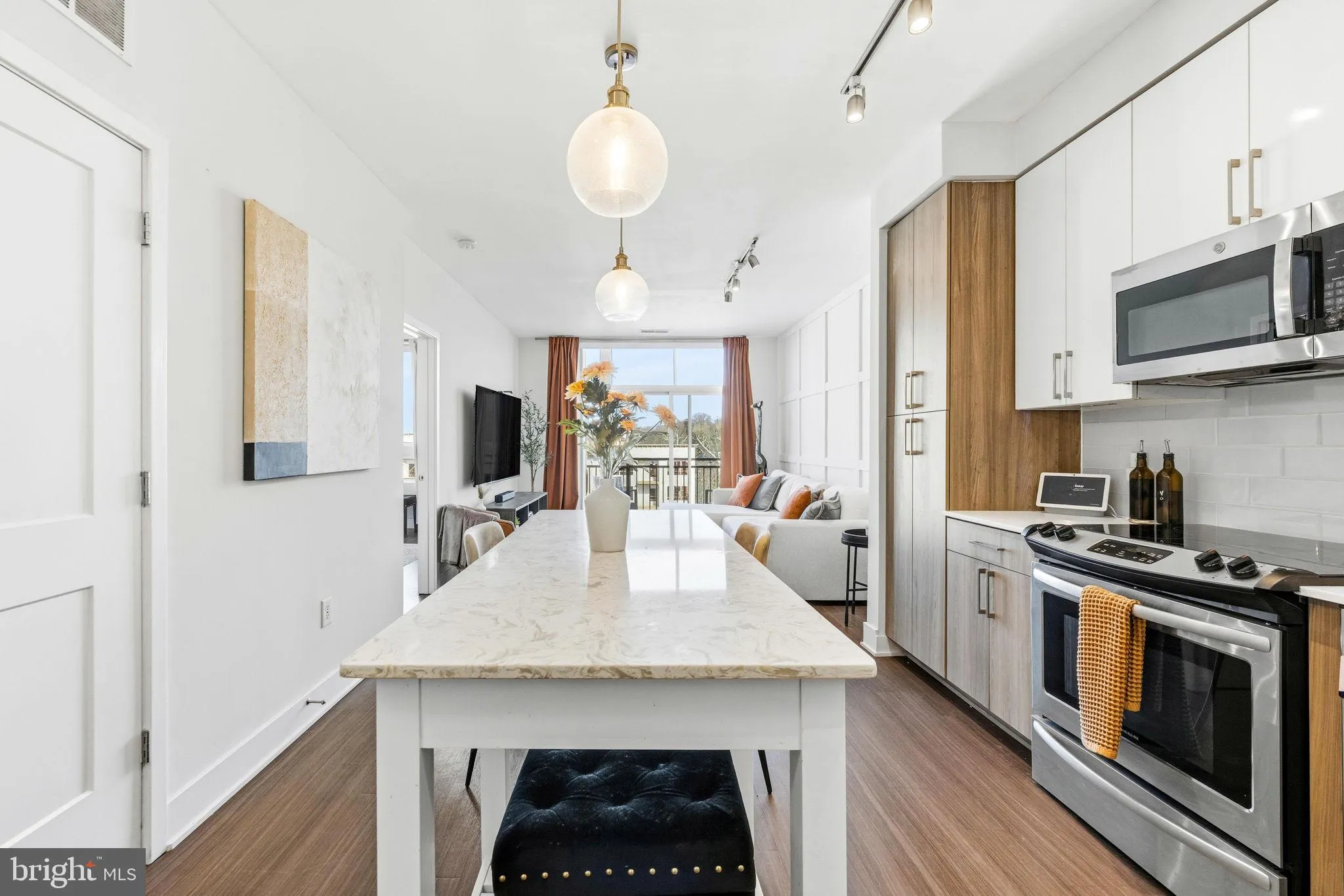 This beautifully updated unit features a modern, open floor plan with upgraded accent walls, stylish lighting, and contemporary finishes that create a polished yet inviting feel. The spacious gourmet kitchen is ideal for entertaining and everyday living, complete with stainless steel appliances and seamless flow into the living and dining areas. The bedroom is generously sized with a large walk-in closet, and the unit also includes an updated washer and dryer for added convenience.
