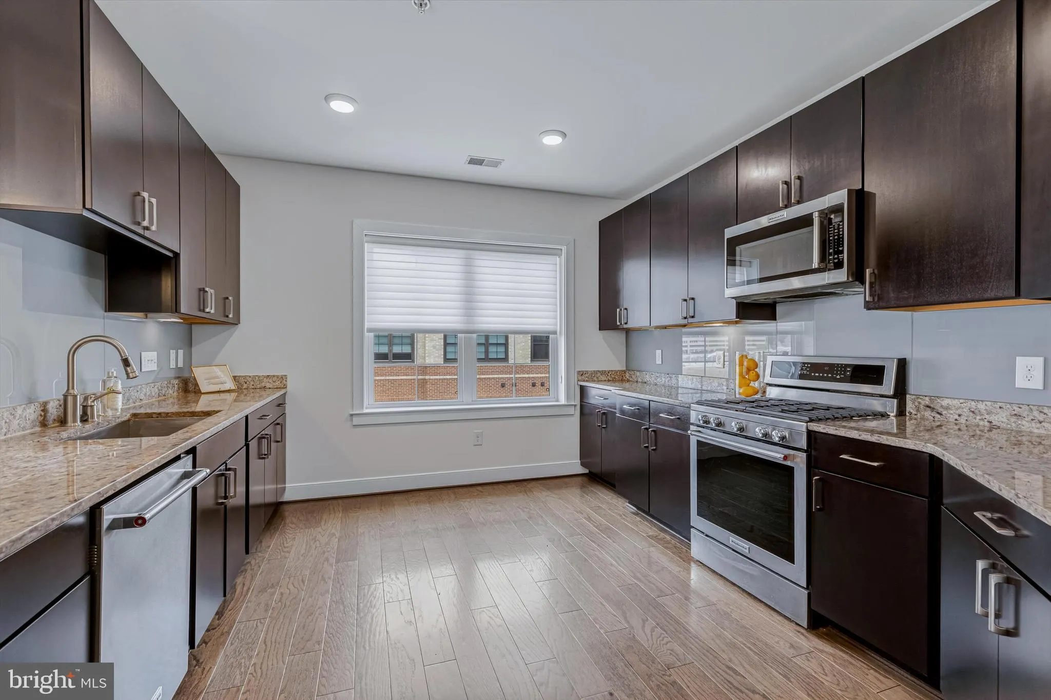Penthouse corner living just steps to the Vienna Metro. Light-filled, top-floor, quiet, and private, this home offers an effortless sense of ease from the moment you walk in. Thoughtfully upgraded and move-in ready, it features 9-foot ceilings, wide plank wood flooring, fresh paint, and an open layout ideal for both everyday living and entertaining. The kitchen is both refined and functional with an upgraded KitchenAid appliance package, granite countertops, custom glass backsplash, under-cabinet lighting, and an oversized undermount sink, flowing seamlessly into the main living space and private deck. Step outside and enjoy a front-row view of the community, perfect for morning coffee or unwinding at the end of the day. The primary suite offers a quiet retreat with a custom walk-in closet and an en suite bath with dual vanities and a spacious shower. Additional highlights include recessed lighting, updated fixtures, ceiling fans in both bedrooms, ample storage, and thoughtful upgrades throughout. Major updates include HVAC with Nest thermostat (2022), LG dryer (2022), and a new LG washer (2025). Two tandem garage parking spaces located near the elevator add everyday convenience, along with secure building access. Located moments from the Vienna Metro with easy access to I-66, I-495, Route 50, and Route 29, and just minutes to Mosaic District, dining, and shopping. MetroWest Square is coming soon, bringing additional amenities and long-term value to the community. A home that feels bright, calm, and easy to enjoy.
