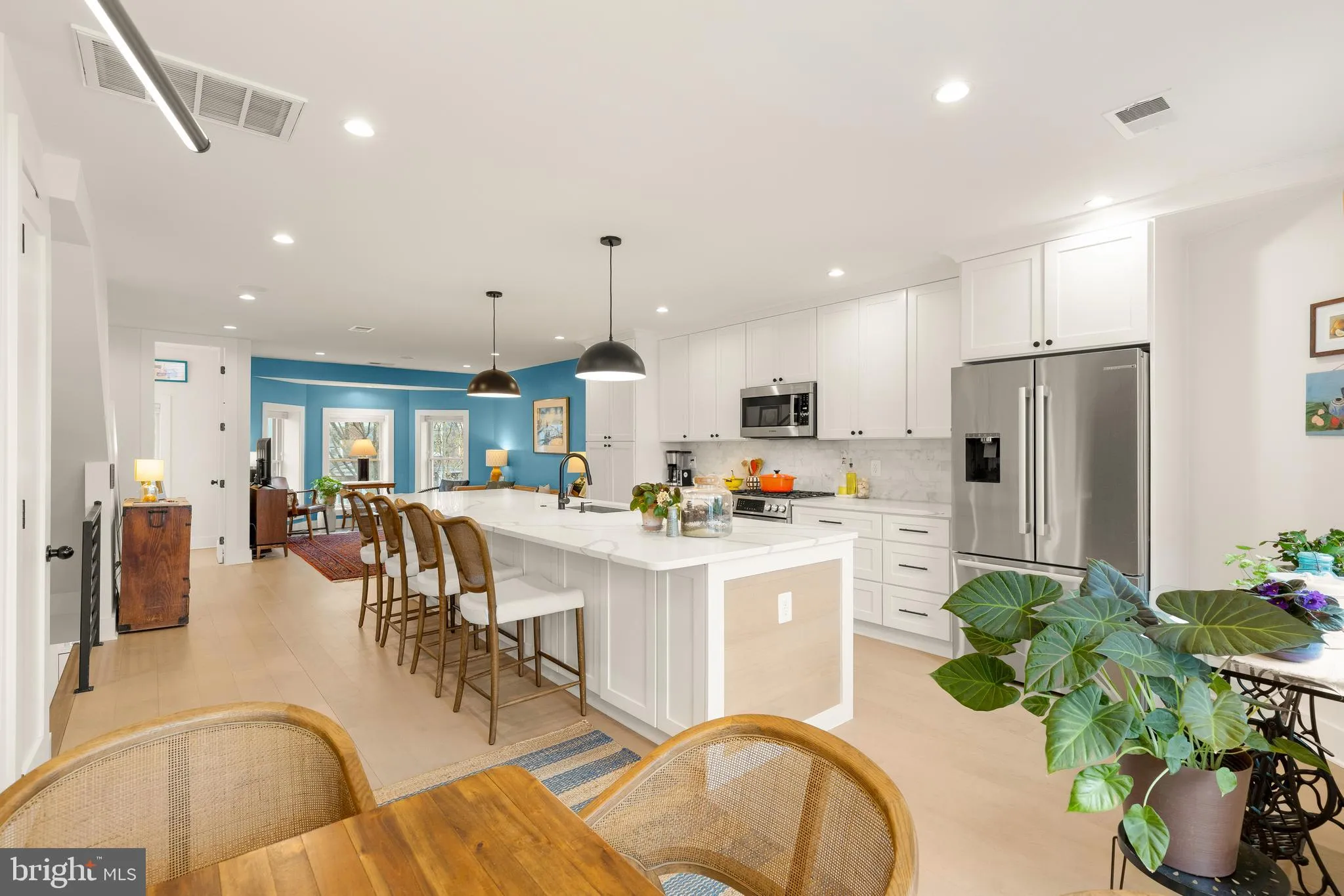 The main level offers an open-concept layout with high ceilings, recessed lighting, and built-in Bluetooth speakers, ideal for both everyday living and entertaining. The chef’s kitchen is designed to impress, featuring floor-to-ceiling cabinetry, stainless steel Bosch appliances, a gas range, and an oversized island with seating and storage on both sides. A dedicated dining area flows seamlessly into the living space, while the 18-foot private patio extends your living outdoors, perfect for entertaining, grilling, or creating your own urban garden.