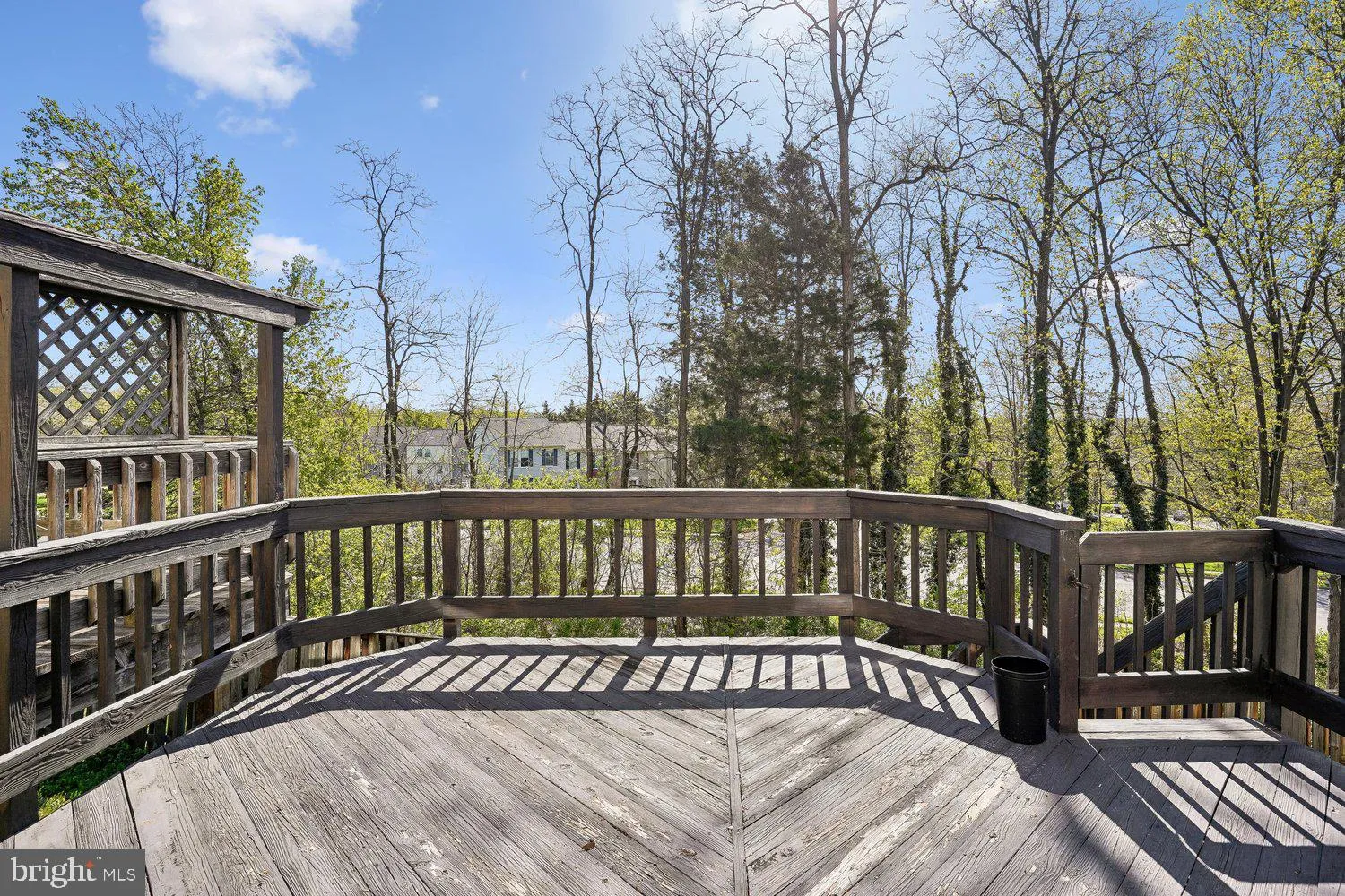 The main living area features a formal dining room with hardwood floors that steps down into the spacious living room, complete with a wood-burning fireplace, hardwood flooring, and access to the deck overlooking trees, with stairs leading to a lower deck.