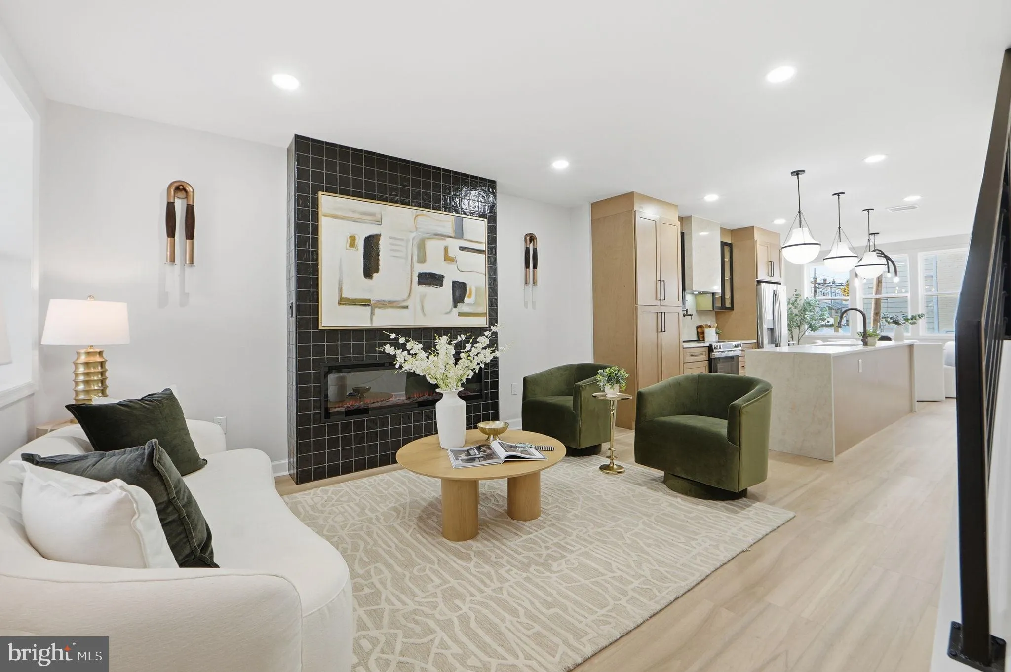 Wide-plank natural oak flooring flows throughout the home, leading to a striking statement fireplace featuring handmade tile and custom bronze wall sconces—an elegant focal point that anchors the living space. The main-level powder room is elevated with a floating marble vanity, adding a refined touch for guests.
