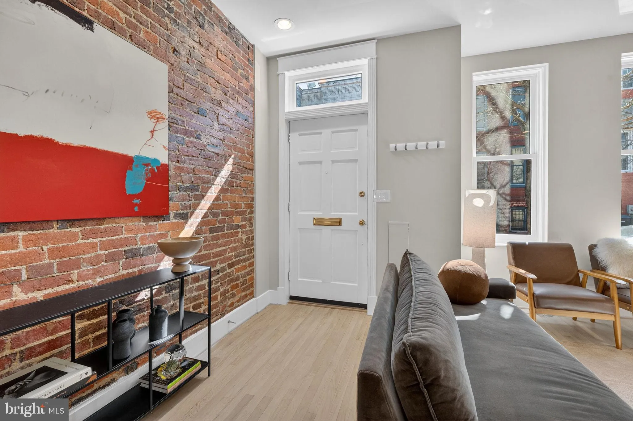 Step inside to a beautiful, sunlit living room featuring a wood-burning fireplace and views of the quaint street outside. Just beyond the fireplace is a spacious dining room that flows seamlessly toward the newly renovated kitchen. The main-level hardwood floors have been beautifully refinished in a white oak wash that perfectly complements the exposed brick wall extending from the living room through the dining room.