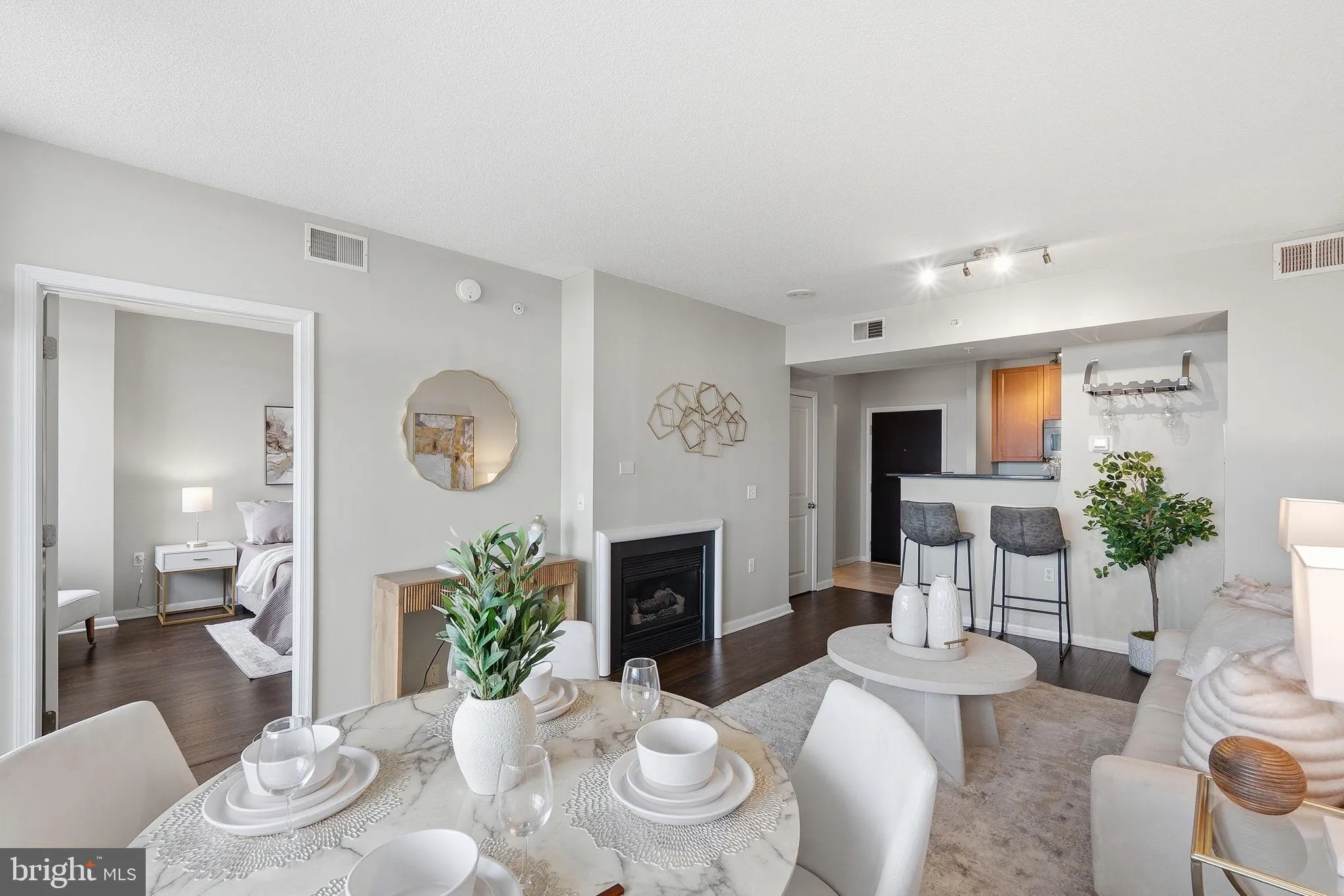 Inside, deep brown hand-scraped engineered wood floors run throughout the living space, creating a warm and sophisticated backdrop. The living room is both inviting and stylish, centered around a gas fireplace and opening directly to the balcony, perfect for enjoying fresh air and those expansive 19th-floor views.